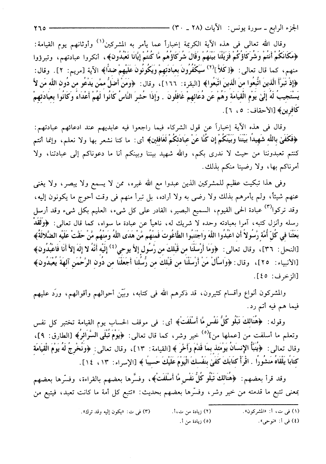 وَقَالَ اللَّهُ تَعَالَى فِي هَذِهِ الْآيَةِ الْكَرِيمَةِ إِخْبَارًا عَمَّا يَأْمُرُ بِهِ الْمُشْرِكِينَ (1) وَأَوْثَانَهُمْ يَوْمَ الْقِيَامَةِ: {مَكَانَكُمْ أَنْتُمْ وَشُرَكَاؤُكُمْ فَزَيَّلْنَا بَيْنَهُمْ وَقَالَ شُرَكَاؤُهُمْ مَا كُنْتُمْ إِيَّانَا تَعْبُدُونَ} أَنْكَرُوا عِبَادَتَهُمْ، وَتَبَرَّءُوا مِنْهُمْ، كَمَا قَالَ تَعَالَى: { [كَلا] سَيَكْفُرُونَ بِعِبَادَتِهِمْ وَيَكُونُونَ عَلَيْهِمْ ضِدًّا} الْآيَةَ. [مَرْيَمَ: 82] . (2) وَقَالَ: {إِذْ تَبَرَّأَ الَّذِينَ اتُّبِعُوا مِنَ الَّذِينَ اتَّبَعُوا} [الْبَقَرَةِ: 166] ، وَقَالَ {وَمَنْ أَضَلُّ مِمَّنْ يَدْعُو مِنْ دُونِ اللَّهِ مَنْ لَا يَسْتَجِيبُ لَهُ إِلَى يَوْمِ الْقِيَامَةِ وَهُمْ عَنْ دُعَائِهِمْ غَافِلُونَ وَإِذَا حُشِرَ النَّاسُ كَانُوا لَهُمْ أَعْدَاءً وَكَانُوا بِعِبَادَتِهِمْ كَافِرِينَ} [الْأَحْقَافِ: 5، 6] .
