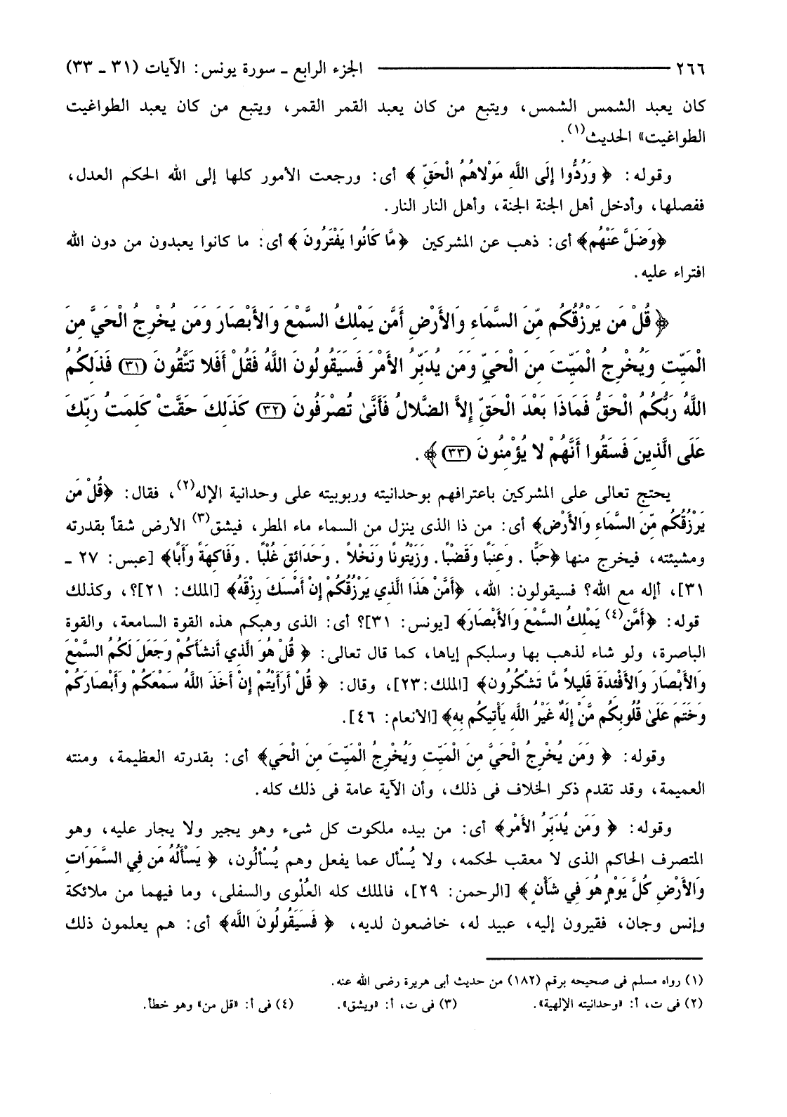 {قُلْ مَنْ يَرْزُقُكُمْ مِنَ السَّمَاءِ وَالأرْضِ أَمْ مَنْ يَمْلِكُ السَّمْعَ وَالأبْصَارَ وَمَنْ يُخْرِجُ الْحَيَّ مِنَ الْمَيِّتِ وَيُخْرِجُ الْمَيِّتَ مِنَ الْحَيِّ وَمَنْ يُدَبِّرُ الأمْرَ فَسَيَقُولُونَ اللَّهُ فَقُلْ أَفَلا (31) فَذَلِكُمُ اللَّهُ رَبُّكُمُ الْحَقُّ فَمَاذَا بَعْدَ الْحَقِّ إِلا الضَّلالُ فَأَنَّى تُصْرَفُونَ (32) كَذَلِكَ حَقَّتْ كَلِمَةُ رَبِّكَ عَلَى الَّذِينَ فَسَقُوا أَنَّهُمْ لَا يُؤْمِنُونَ (33) }