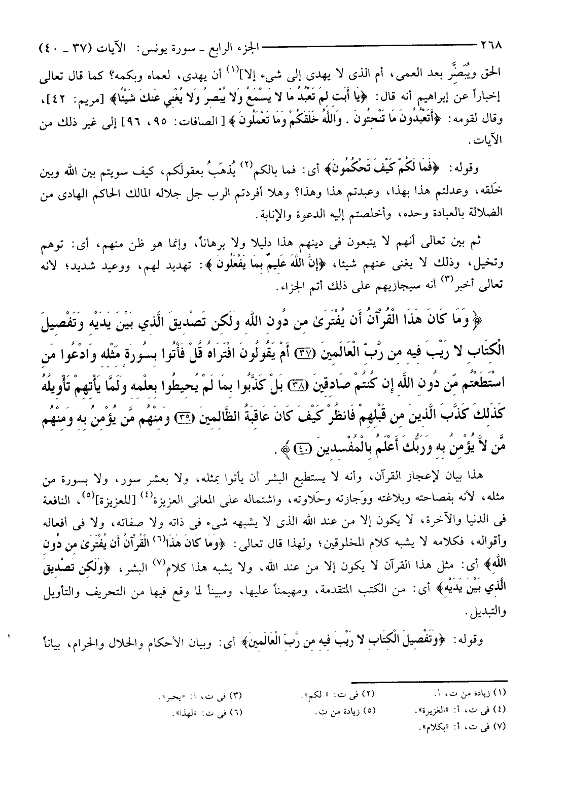 {وَمَا كَانَ هَذَا الْقُرْآنُ أَنْ يُفْتَرَى مِنْ دُونِ اللَّهِ وَلَكِنْ تَصْدِيقَ الَّذِي بَيْنَ يَدَيْهِ وَتَفْصِيلَ الْكِتَابِ لَا رَيْبَ فِيهِ مِنْ رَبِّ الْعَالَمِينَ (37) أَمْ يَقُولُونَ افْتَرَاهُ قُلْ فَأْتُوا بِسُورَةٍ مِثْلِهِ وَادْعُوا مَنِ اسْتَطَعْتُمْ مِنْ دُونِ اللَّهِ إِنْ كُنْتُمْ صَادِقِينَ (38) بَلْ كَذَّبُوا بِمَا لَمْ يُحِيطُوا بِعِلْمِهِ وَلَمَّا يَأْتِهِمْ تَأْوِيلُهُ كَذَلِكَ كَذَّبَ الَّذِينَ مِنْ قَبْلِهِمْ فَانْظُرْ كَيْفَ كَانَ عَاقِبَةُ الظَّالِمِينَ (39) وَمِنْهُمْ مَنْ يُؤْمِنُ بِهِ وَمِنْهُمْ مَنْ لَا يُؤْمِنُ بِهِ وَرَبُّكَ أَعْلَمُ بِالْمُفْسِدِينَ (40) }