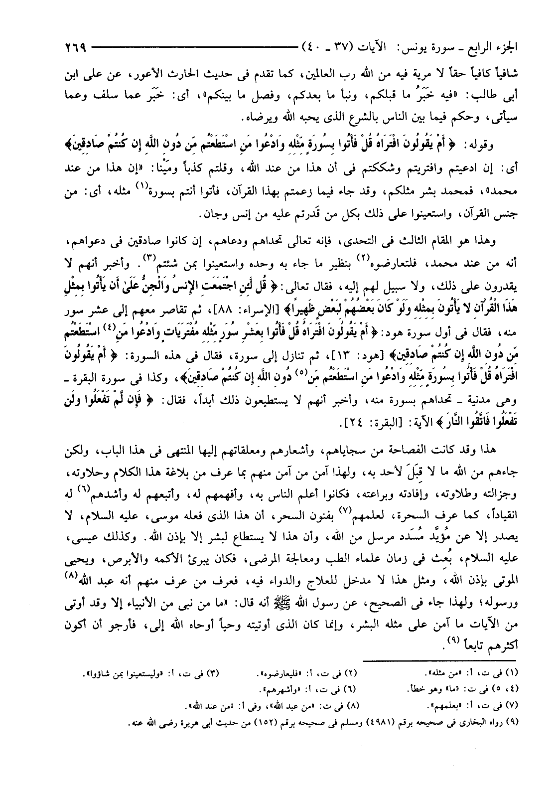 وَقَوْلُهُ: {أَمْ يَقُولُونَ افْتَرَاهُ قُلْ فَأْتُوا بِسُورَةٍ مِثْلِهِ وَادْعُوا مَنِ اسْتَطَعْتُمْ مِنْ دُونِ اللَّهِ إِنْ كُنْتُمْ صَادِقِينَ} أَيْ: إِنِ ادَّعَيْتُمْ وَافْتَرَيْتُمْ وَشَكَكْتُمْ فِي أَنَّ هَذَا مِنْ عِنْدِ اللَّهِ، وَقُلْتُمْ كَذِبًا ومَيْنا: "إِنَّ هَذَا مِنْ عِنْدِ مُحَمَّدٍ"، فَمُحَمَّدٌ بَشَرٌ مِثْلُكُمْ، وَقَدْ جَاءَ فِيمَا زَعَمْتُمْ بِهَذَا الْقُرْآنِ، فَأْتُوا أَنْتُمْ بِسُورَةٍ (1) مِثْلِهِ، أَيْ: مِنْ جِنْسِ الْقُرْآنِ، وَاسْتَعِينُوا عَلَى ذَلِكَ بِكُلِّ مَنْ قَدرتم عَلَيْهِ مِنْ إِنْسٍ وَجَانٍّ.
