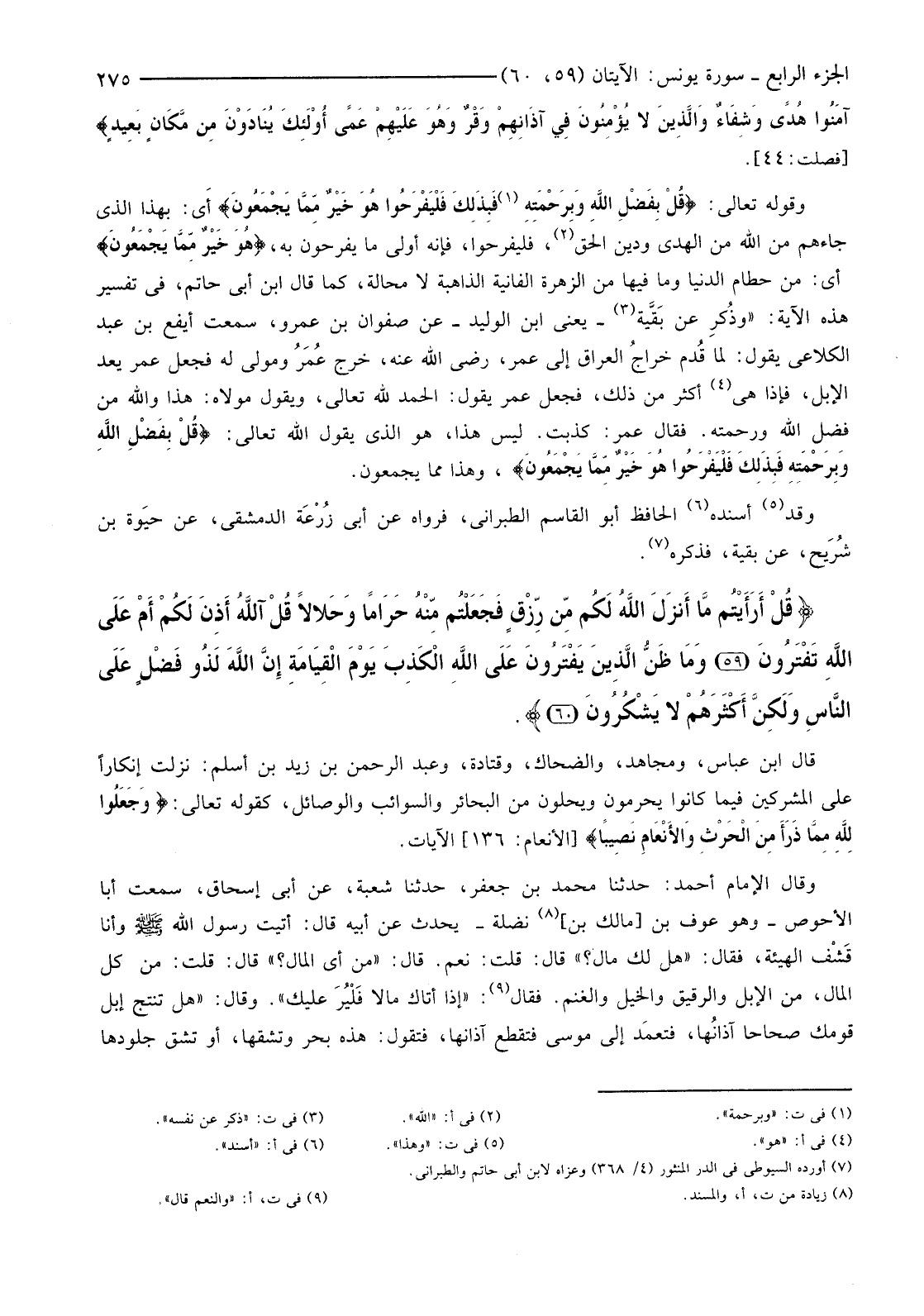 وَقَوْلُهُ تَعَالَى: {قُلْ بِفَضْلِ اللَّهِ وَبِرَحْمَتِهِ فَبِذَلِكَ فَلْيَفْرَحُوا هُوَ خَيْرٌ مِمَّا يَجْمَعُونَ} (1) أَيْ: بِهَذَا الَّذِي جَاءَهُمْ مِنَ اللَّهِ مِنَ الْهُدَى وَدِينِ الْحَقِّ (2) فَلْيَفْرَحُوا، فَإِنَّهُ أَوْلَى مَا يَفْرَحُونَ بِهِ، {هُوَ خَيْرٌ مِمَّا يَجْمَعُونَ} أَيْ: مِنْ حُطَامِ الدُّنْيَا وَمَا فِيهَا مِنَ الزَّهْرَةِ الْفَانِيَةِ الذَّاهِبَةِ لَا مَحَالَةَ، كَمَا قَالَ ابْنُ أَبِي حَاتِمٍ، فِي تَفْسِيرِ هَذِهِ الْآيَةِ: "وذُكِر عَنْ بَقيَّة (3) -يَعْنِي ابْنَ الْوَلِيدِ -عَنْ صَفْوَانَ بْنِ عَمْرٍو، سَمِعْتُ أَيْفَعَ بْنَ عَبْدٍ الْكُلَاعِيَّ يَقُولُ: لَمَّا قُدم خراجُ الْعِرَاقِ إِلَى عُمَرَ، رَضِيَ اللَّهُ عَنْهُ، خَرَجَ عُمَرُ وَمَوْلًى لَهُ فَجَعَلَ عُمَرُ يَعُدُّ الْإِبِلَ، فَإِذَا هِيَ (4) أَكْثَرُ مِنْ ذَلِكَ، فَجَعَلَ عُمَرُ يَقُولُ: الْحَمْدُ لِلَّهِ تَعَالَى، وَيَقُولُ مَوْلَاهُ: هَذَا وَاللَّهِ مِنْ فَضْلِ اللَّهِ وَرَحْمَتِهِ. فَقَالَ عُمَرُ: كَذَبْتَ. لَيْسَ هَذَا، هُوَ الَّذِي يَقُولُ اللَّهُ تَعَالَى: {قُلْ بِفَضْلِ اللَّهِ وَبِرَحْمَتِهِ فَبِذَلِكَ فَلْيَفْرَحُوا هُوَ خَيْرٌ مِمَّا يَجْمَعُونَ} وَهَذَا مِمَّا يَجْمَعُونَ.