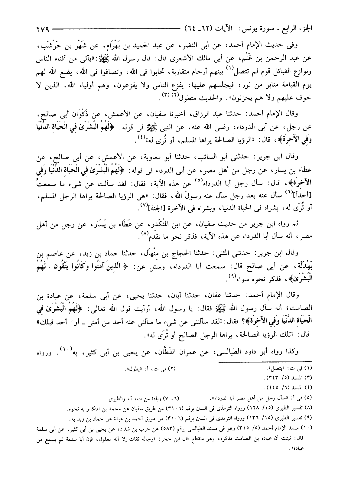 وَقَالَ ابْنُ جَرِيرٍ: حَدَّثَنِي الْمُثَنَّى: حَدَّثَنَا الْحَجَّاجُ بْنُ مِنْهَال، حَدَّثَنَا حَمَّادُ بْنُ زَيْدٍ، عَنْ عَاصِمِ بْنِ بَهْدَلَة، عَنْ أَبِي صَالِحٍ قَالَ: سَمِعْتُ أَبَا الدَّرْدَاءِ، وَسُئِلَ عَنِ: {الَّذِينَ آمَنُوا وَكَانُوا يَتَّقُونَ لَهُمُ الْبُشْرَى} فَذَكَرَ نَحْوَهُ سَوَاءً. (9)