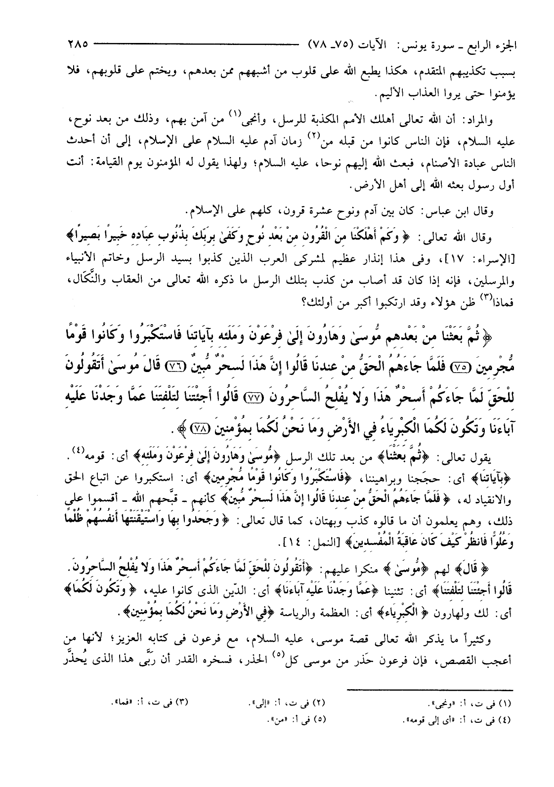 {ثُمَّ بَعَثْنَا مِنْ بَعْدِهِمْ مُوسَى وَهَارُونَ إِلَى فِرْعَوْنَ وَمَلَئِهِ بِآيَاتِنَا فَاسْتَكْبَرُوا وَكَانُوا قَوْمًا مُجْرِمِينَ (75) فَلَمَّا جَاءَهُمُ الْحَقُّ مِنْ عِنْدِنَا قَالُوا إِنَّ هَذَا لَسِحْرٌ مُبِينٌ (76) قَالَ مُوسَى أَتَقُولُونَ لِلْحَقِّ لَمَّا جَاءَكُمْ أَسِحْرٌ هَذَا وَلا يُفْلِحُ السَّاحِرُونَ (77) قَالُوا أَجِئْتَنَا لِتَلْفِتَنَا عَمَّا وَجَدْنَا عَلَيْهِ آبَاءَنَا وَتَكُونَ لَكُمَا الْكِبْرِيَاءُ فِي الأرْضِ وَمَا نَحْنُ لَكُمَا بِمُؤْمِنِينَ (78) }