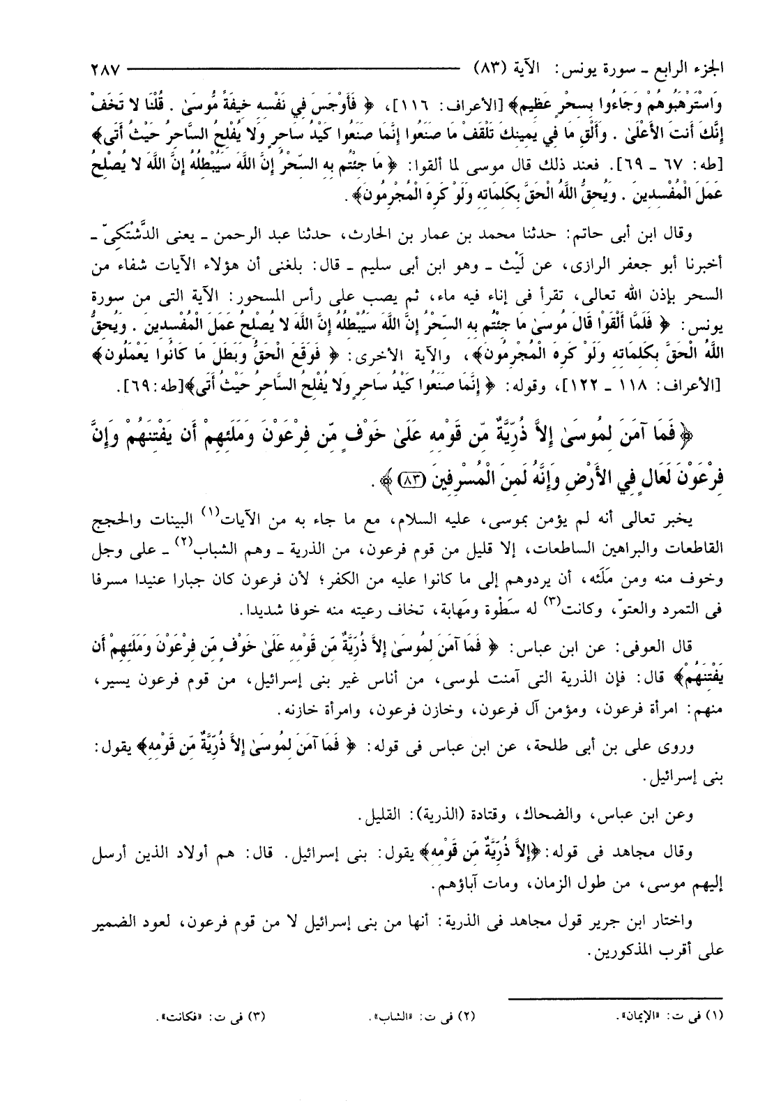 {فَمَا آمَنَ لِمُوسَى إِلا ذُرِّيَّةٌ مِنْ قَوْمِهِ عَلَى خَوْفٍ مِنْ فِرْعَوْنَ وَمَلَئِهِمْ أَنْ يَفْتِنَهُمْ وَإِنَّ فِرْعَوْنَ لَعَالٍ فِي الأرْضِ وَإِنَّهُ لَمِنَ الْمُسْرِفِينَ (83) }