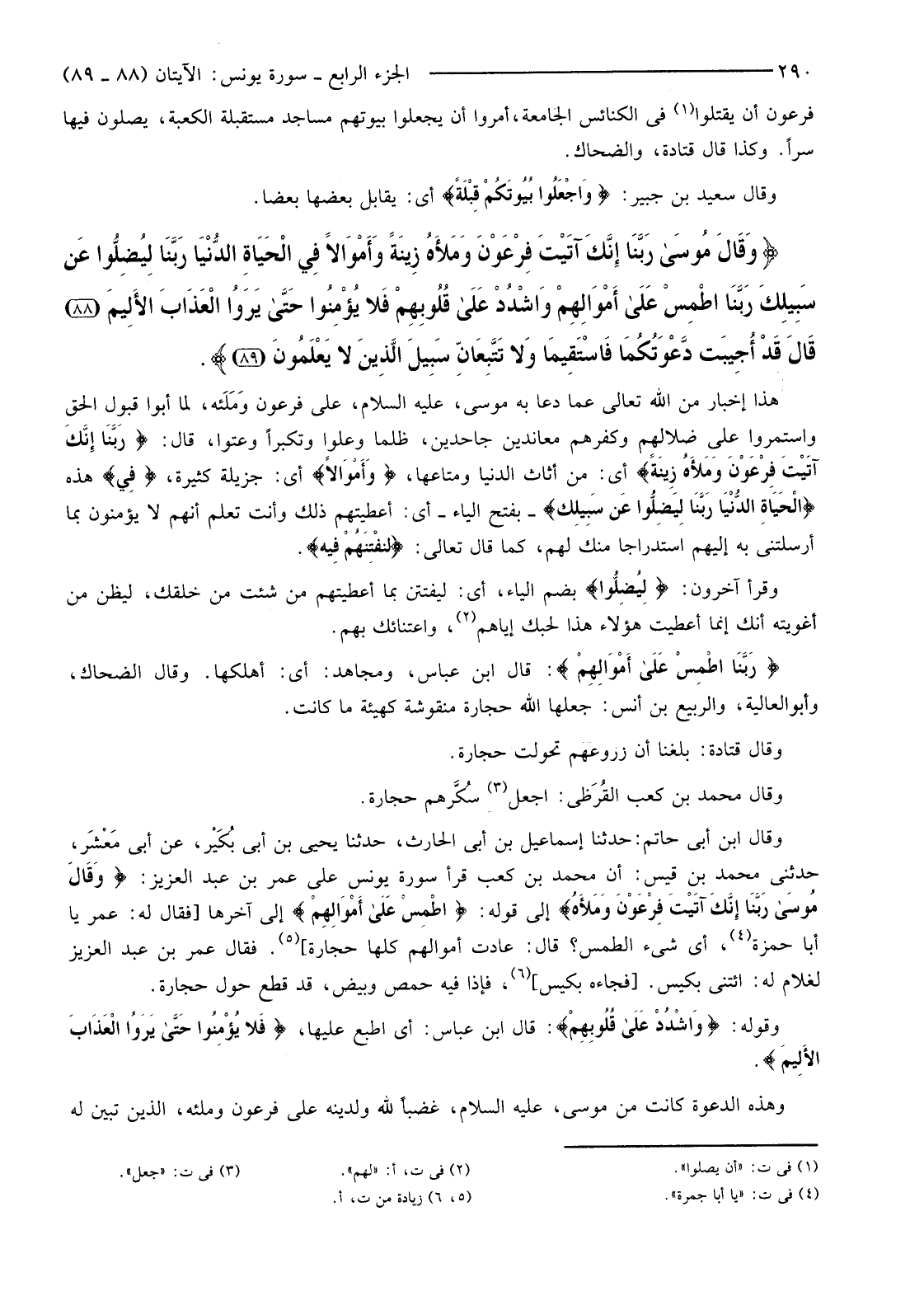 {وَقَالَ مُوسَى رَبَّنَا إِنَّكَ آتَيْتَ فِرْعَوْنَ وَمَلأهُ زِينَةً وَأَمْوَالا فِي الْحَيَاةِ الدُّنْيَا رَبَّنَا لِيُضِلُّوا عَنْ سَبِيلِكَ رَبَّنَا اطْمِسْ عَلَى أَمْوَالِهِمْ وَاشْدُدْ عَلَى قُلُوبِهِمْ فَلا يُؤْمِنُوا حَتَّى يَرَوُا الْعَذَابَ الألِيمَ (88) }