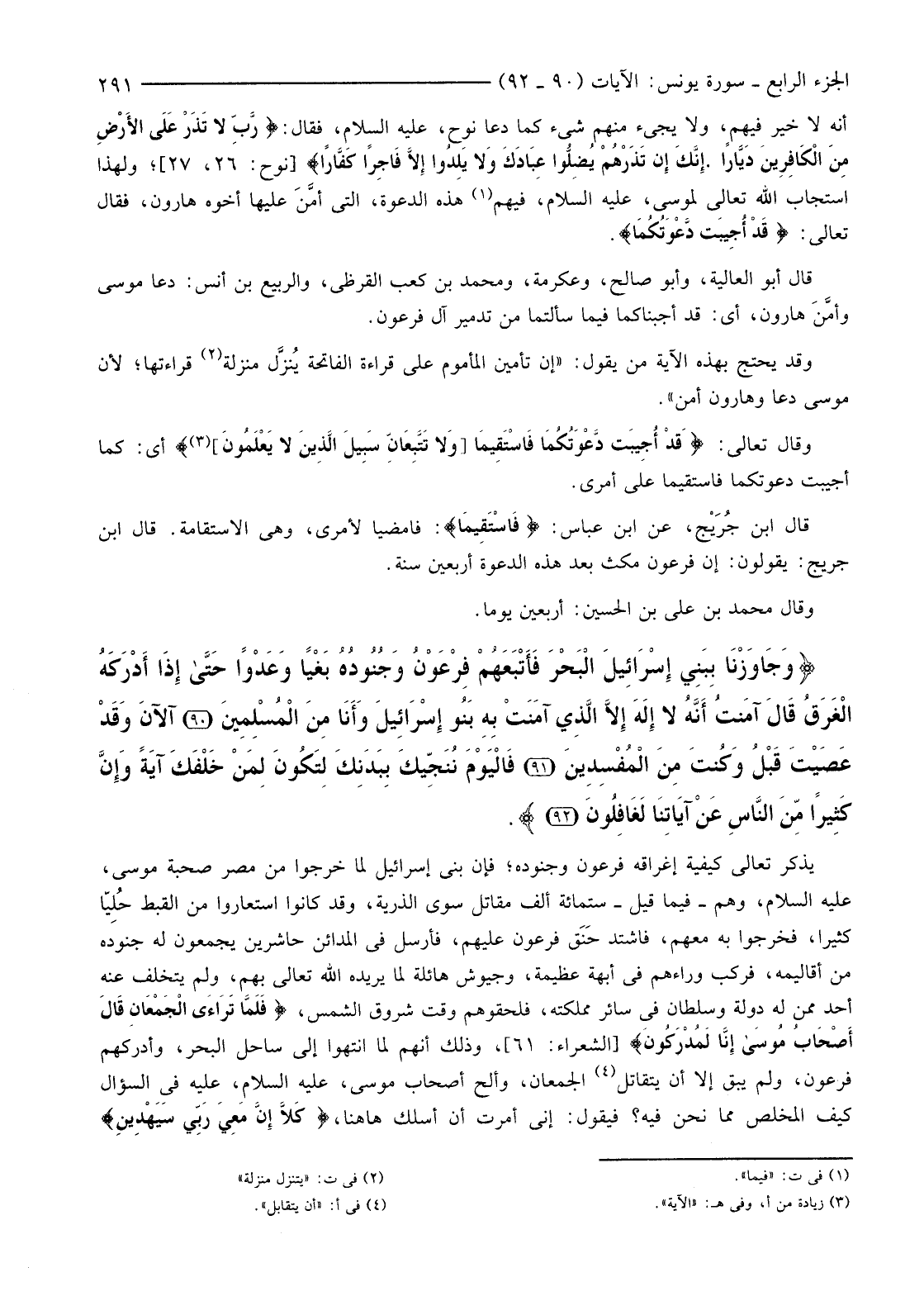 {وَجَاوَزْنَا بِبَنِي إِسْرَائِيلَ الْبَحْرَ فَأَتْبَعَهُمْ فِرْعَوْنُ وَجُنُودُهُ بَغْيًا وَعَدْوًا حَتَّى إِذَا أَدْرَكَهُ الْغَرَقُ قَالَ آمَنْتُ أَنَّهُ لَا إِلَهَ إِلا الَّذِي آمَنَتْ بِهِ بَنُو إِسْرَائِيلَ وَأَنَا مِنَ الْمُسْلِمِينَ (90) آلآنَ وَقَدْ عَصَيْتَ قَبْلُ وَكُنْتَ مِنَ الْمُفْسِدِينَ (91) فَالْيَوْمَ نُنَجِّيكَ بِبَدَنِكَ لِتَكُونَ لِمَنْ خَلْفَكَ آيَةً وَإِنَّ كَثِيرًا مِنَ النَّاسِ عَنْ آيَاتِنَا لَغَافِلُونَ (92) }