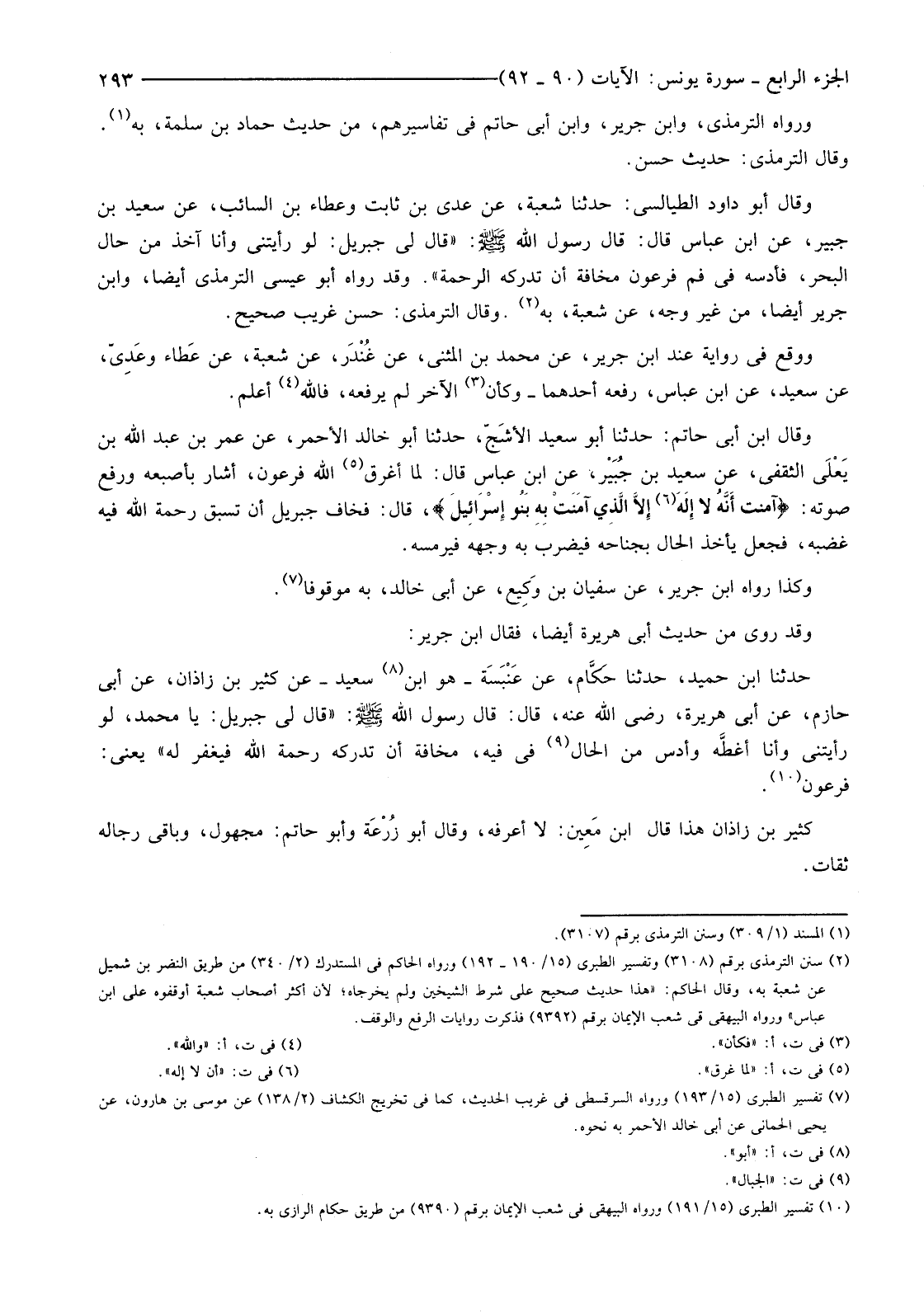 وَقَالَ ابْنُ أَبِي حَاتِمٍ: حَدَّثَنَا أَبُو سَعِيدٍ الأشَجّ، حَدَّثَنَا أَبُو خَالِدٍ الْأَحْمَرُ، عَنْ عُمَرَ بْنِ عَبْدِ اللَّهِ بْنِ يَعْلَى الثَّقَفِيِّ، عَنْ سَعِيدِ بْنِ جُبَيْر، عَنِ ابْنِ عَبَّاسٍ قَالَ: لَمَّا أَغْرَقَ (5) اللَّهُ فِرْعَوْنَ، أَشَارَ بِأُصْبُعِهِ وَرَفَعَ صَوْتَهُ: {آمَنْتُ أَنَّهُ لَا إِلَهَ إِلا الَّذِي آمَنَتْ بِهِ بَنُو إِسْرَائِيلَ} (6) قَالَ: فَخَافَ جِبْرِيلُ أَنْ تَسْبِقَ رَحْمَةُ اللَّهِ فِيهِ غَضَبَهُ، فَجَعَلَ يَأْخُذُ الْحَالَ بِجَنَاحَيْهِ فَيَضْرِبُ بِهِ وَجْهَهُ فَيَرْمُسُهُ.