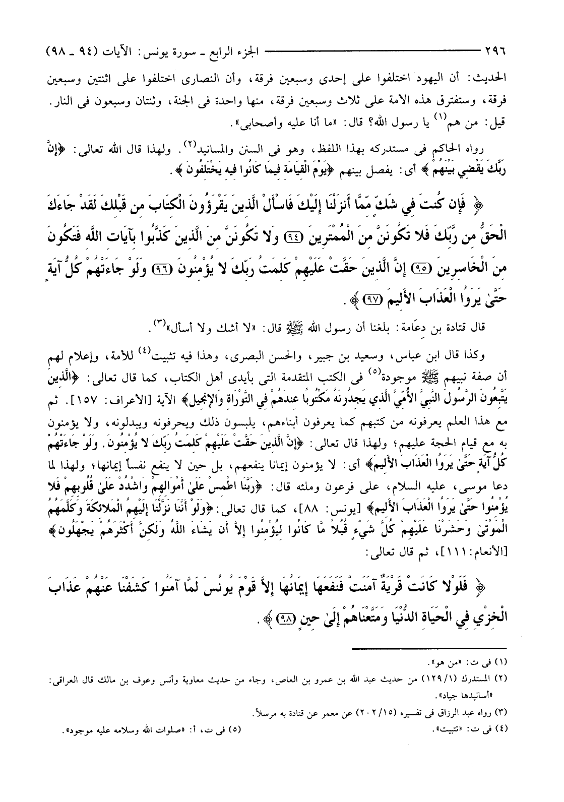 {فَإِنْ كُنْتَ فِي شَكٍّ مِمَّا أَنزلْنَا إِلَيْكَ فَاسْأَلِ الَّذِينَ يَقْرَءُونَ الْكِتَابَ مِنْ قَبْلِكَ لَقَدْ جَاءَكَ الْحَقُّ مِنْ رَبِّكَ فَلا تَكُونَنَّ مِنَ الْمُمْتَرِينَ (94) وَلا تَكُونَنَّ مِنَ الَّذِينَ كَذَّبُوا بِآيَاتِ اللَّهِ فَتَكُونَ مِنَ الْخَاسِرِينَ (95) إِنَّ الَّذِينَ حَقَّتْ عَلَيْهِمْ كَلِمَةُ رَبِّكَ لَا يُؤْمِنُونَ (96) وَلَوْ جَاءَتْهُمْ كُلُّ آيَةٍ حَتَّى يَرَوُا الْعَذَابَ الألِيمَ (97) }