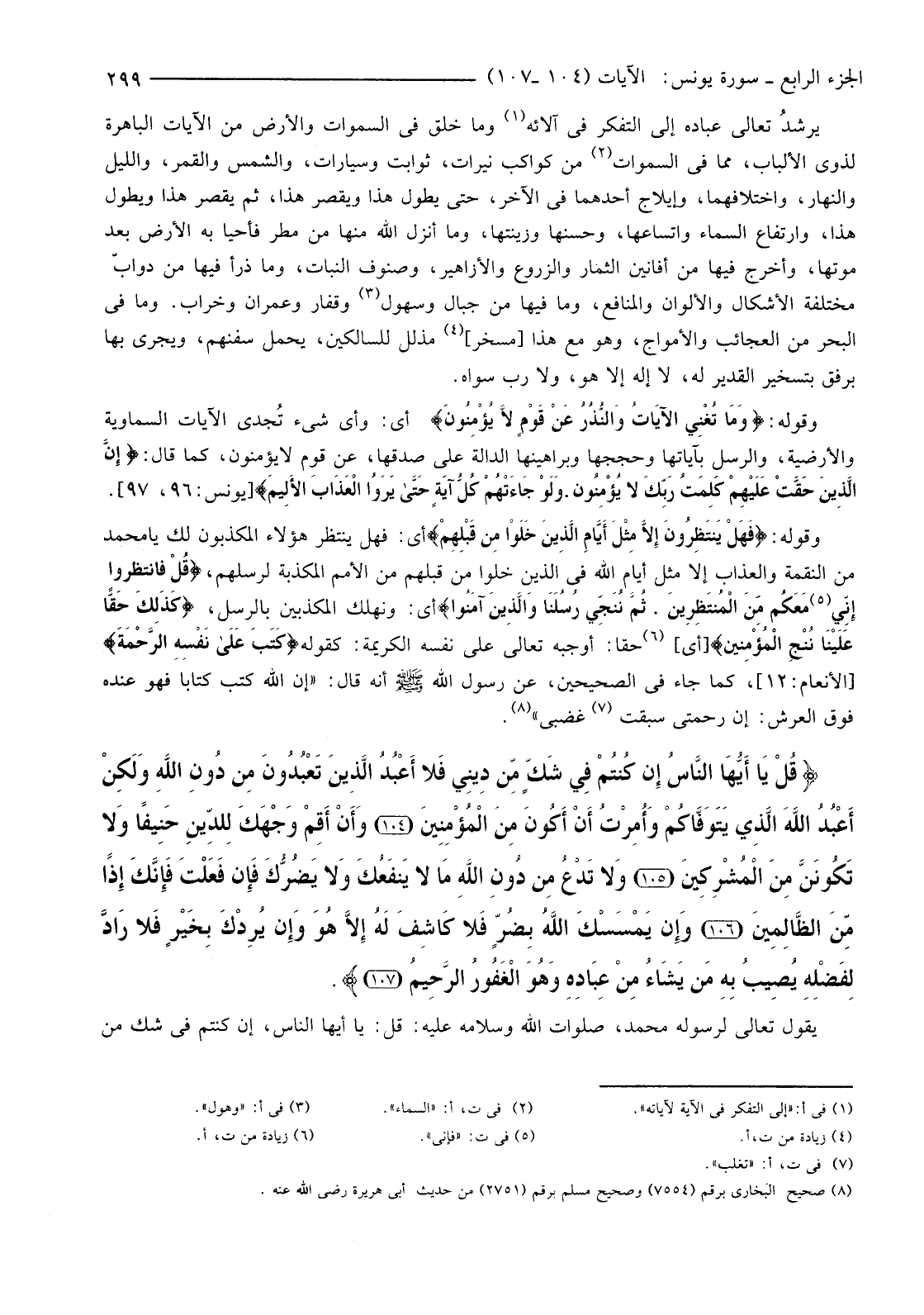 {قُلْ يَا أَيُّهَا النَّاسُ إِنْ كُنْتُمْ فِي شَكٍّ مِنْ دِينِي فَلا أَعْبُدُ الَّذِينَ تَعْبُدُونَ مِنْ دُونِ اللَّهِ وَلَكِنْ أَعْبُدُ اللَّهَ الَّذِي يَتَوَفَّاكُمْ وَأُمِرْتُ أَنْ أَكُونَ مِنَ الْمُؤْمِنِينَ (104) وَأَنْ أَقِمْ وَجْهَكَ لِلدِّينِ حَنِيفًا وَلا تَكُونَنَّ مِنَ الْمُشْرِكِينَ (105) وَلا تَدْعُ مِنْ دُونِ اللَّهِ مَا لَا يَنْفَعُكَ وَلا يَضُرُّكَ فَإِنْ فَعَلْتَ فَإِنَّكَ إِذًا مِنَ الظَّالِمِينَ (106) }