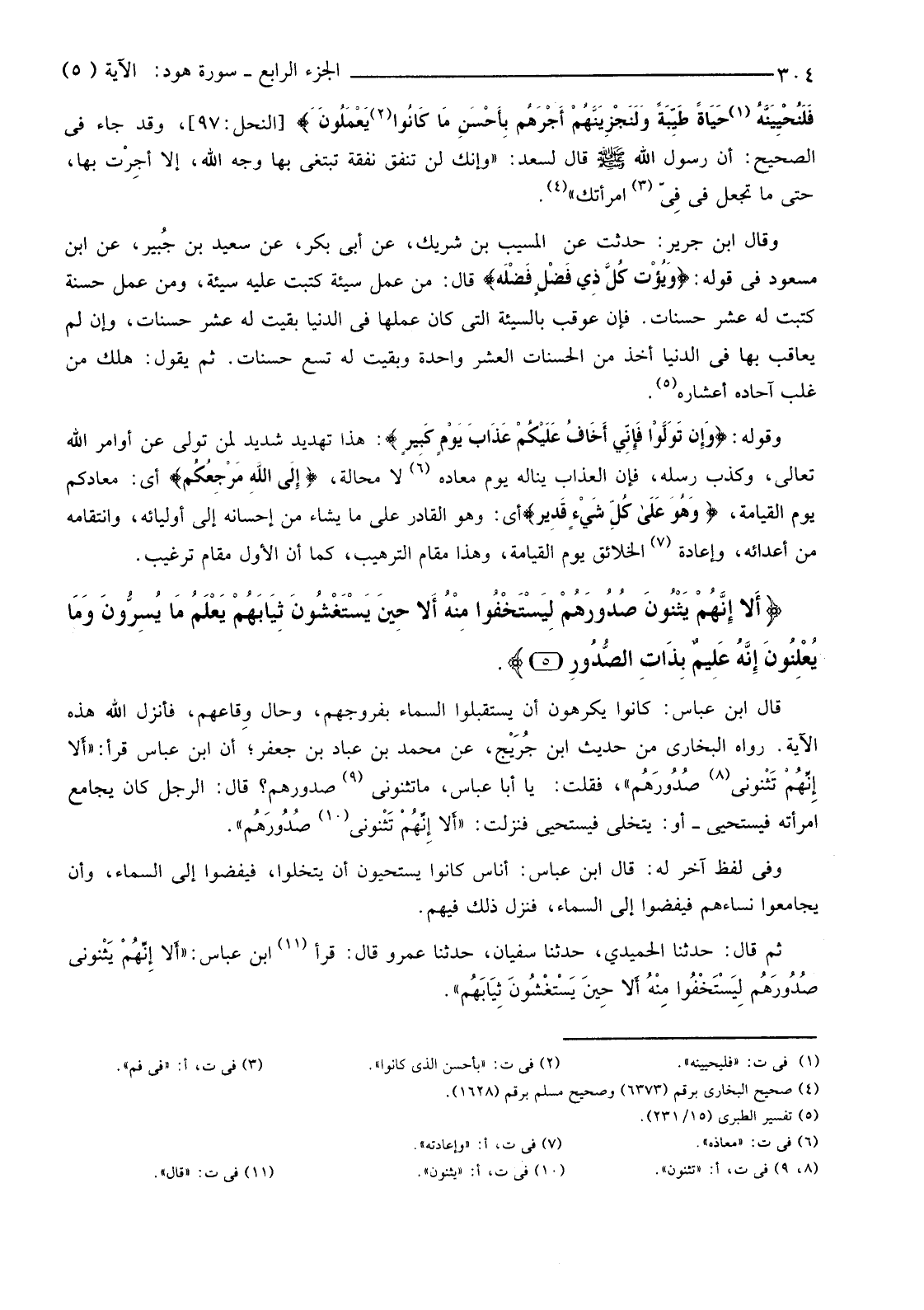 قَالَ ابْنُ عَبَّاسٍ: كَانُوا يَكْرَهُونَ أَنْ يَسْتَقْبِلُوا السَّمَاءَ بِفُرُوجِهِمْ، وَحَالَ وَقَّاعِهِمْ، فَأَنْزَلَ اللَّهُ هَذِهِ الْآيَةَ. رَوَاهُ الْبُخَارِيُّ مِنْ حَدِيثِ ابْنِ جُرَيْج، عَنْ مُحَمَّدِ بْنِ عَبَّادِ بْنِ جَعْفَرٍ؛ أَنَّ ابْنَ عَبَّاسِ قَرَأَ: "أَلا إِنِّهُمْ تَثْنوني (6) صُدُورهُم"، فَقُلْتُ: يَا أَبَا عَبَّاسٍ، مَا تَثْنُونِي (7) صُدُورَهُمْ؟ قَالَ: الرَّجُلُ كَانَ يُجَامِعُ امْرَأَتَهُ فَيَسْتَحْيِي -أَوْ: يَتَخَلَّى فَيَسْتَحْيِي فَنَزَلَتْ: "أَلا إِنِّهُمْ تَثْنوني (8) صُدُورهُم".