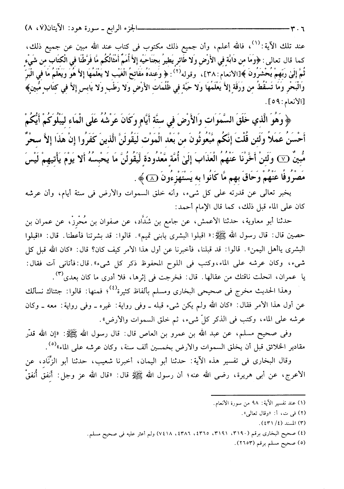 وَفِي صَحِيحِ مُسْلِمٍ، عَنْ عَبْدِ اللَّهِ بْنِ عَمْرِو بْنِ الْعَاصِ قَالَ: قَالَ رَسُولُ اللَّهِ صَلَّى اللَّهُ عَلَيْهِ وسلم: "إِنَّ اللَّهَ قَدَّرَ مَقَادِيرَ الْخَلَائِقِ قَبْلَ أَنْ يَخْلُقَ السَّمَوَاتِ وَالْأَرْضَ بِخَمْسِينَ أَلْفَ سَنَةٍ، وَكَانَ عَرْشُهُ عَلَى الْمَاءِ" (5) .