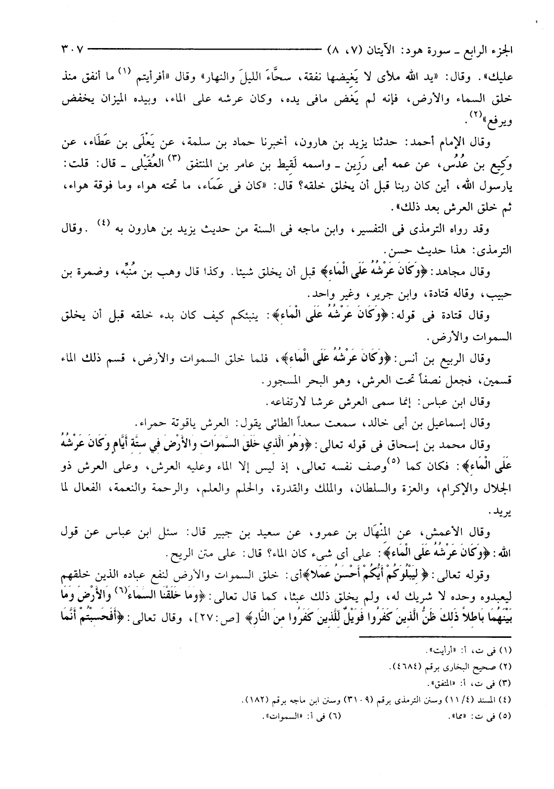 وَقَالَ مُحَمَّدُ بْنُ إِسْحَاقَ فِي قَوْلِهِ تَعَالَى: {وَهُوَ الَّذِي خَلَقَ السَّمَاوَاتِ وَالأرْضَ فِي سِتَّةِ أَيَّامٍ وَكَانَ عَرْشُهُ عَلَى الْمَاءِ} فَكَانَ كَمَا (5) وَصَفَ نَفْسَهُ تَعَالَى، إِذْ لَيْسَ إِلَّا الْمَاءُ وَعَلَيْهِ الْعَرْشُ، وَعَلَى الْعَرْشِ ذُو الْجَلَالِ وَالْإِكْرَامِ، وَالْعِزَّةِ وَالسُّلْطَانِ، وَالْمُلْكِ وَالْقُدْرَةِ، وَالْحِلْمِ وَالْعِلْمِ، وَالرَّحْمَةِ وَالنِّعْمَةِ، الْفَعَّالُ لِمَا يُرِيدُ.
