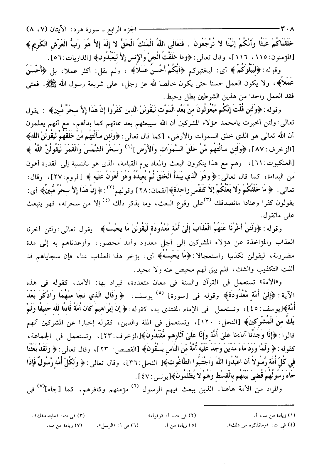 وَ"الْأُمَّةُ" تُسْتَعْمَلُ فِي الْقُرْآنِ وَالسُّنَّةِ فِي مَعَانٍ مُتَعَدِّدَةٍ، فَيُرَادُ بِهَا: الْأَمَدُ، كَقَوْلِهِ فِي هَذِهِ الْآيَةِ: {إِلَى أُمَّةٍ مَعْدُودَةٍ} وَقَوْلِهِ فِي [سُورَةِ] (5) يُوسُفَ: {وَقَالَ الَّذِي نَجَا مِنْهُمَا وَادَّكَرَ بَعْدَ أُمَّةٍ} [يُوسُفَ:45] ، وَتُسْتَعْمَلُ فِي الْإِمَامِ الْمُقْتَدَى بِهِ، كَقَوْلِهِ: {إِنَّ إِبْرَاهِيمَ كَانَ أُمَّةً قَانِتًا لِلَّهِ حَنِيفًا وَلَمْ يَكُ مِنَ الْمُشْرِكِينَ} [النَّحْلِ:120] ، وَتُسْتَعْمَلُ فِي الْمِلَّةِ وَالدِّينِ، كَقَوْلِهِ إِخْبَارًا عَنِ الْمُشْرِكِينَ أَنَّهُمْ قَالُوا: {إِنَّا وَجَدْنَا آبَاءَنَا عَلَى أُمَّةٍ وَإِنَّا عَلَى آثَارِهِمْ مُقْتَدُونَ} [الزُّخْرُفِ:23] ، وَتُسْتَعْمَلُ فِي الْجَمَاعَةِ، كَقَوْلِهِ: {وَلَمَّا وَرَدَ مَاءَ مَدْيَنَ وَجَدَ عَلَيْهِ أُمَّةً مِنَ النَّاسِ يَسْقُونَ} [الْقَصَصِ:23] ، وَقَالَ تَعَالَى: {وَلَقَدْ بَعَثْنَا فِي كُلِّ أُمَّةٍ رَسُولا أَنِ اُعْبُدُوا اللَّهَ وَاجْتَنِبُوا الطَّاغُوتَ} [النَّحْلِ:36] ، وَقَالَ تَعَالَى: {وَلِكُلِّ أُمَّةٍ رَسُولٌ فَإِذَا جَاءَ رَسُولُهُمْ قُضِيَ بَيْنَهُمْ بِالْقِسْطِ وَهُمْ لَا يُظْلَمُونَ} [يُونُسَ:47] .