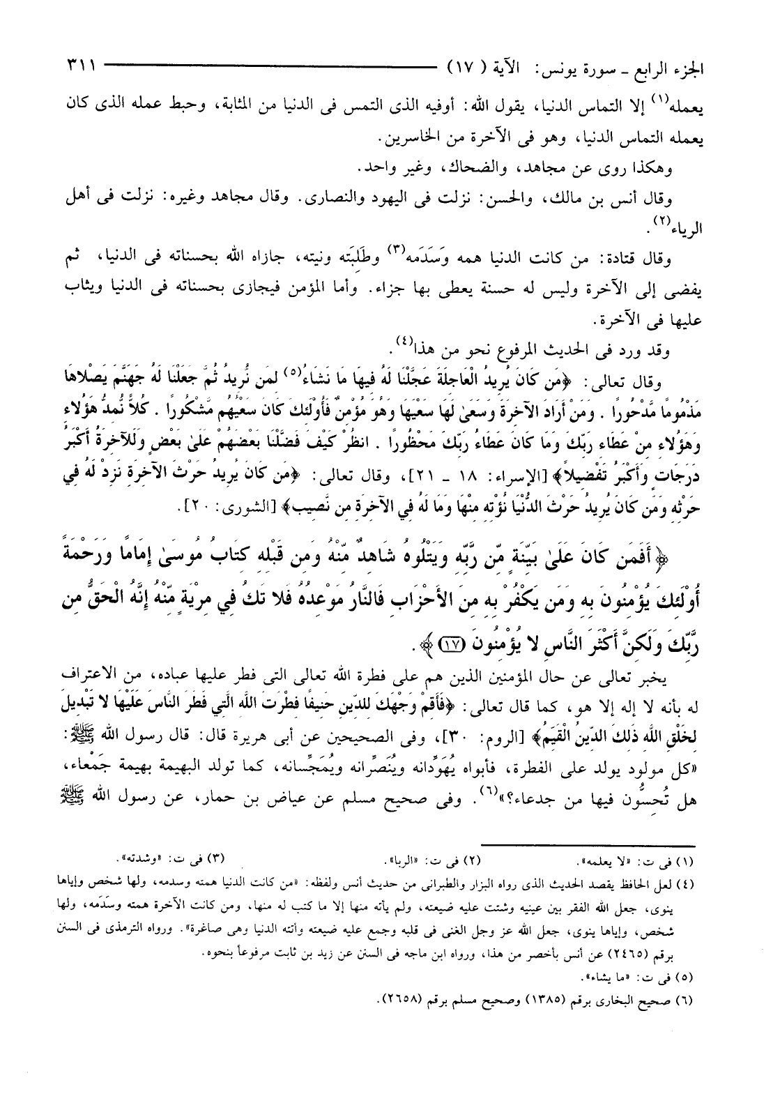 وَقَالَ تَعَالَى: {مَنْ كَانَ يُرِيدُ الْعَاجِلَةَ عَجَّلْنَا لَهُ فِيهَا مَا نَشَاءُ لِمَنْ نُرِيدُ ثُمَّ جَعَلْنَا لَهُ جَهَنَّمَ يَصْلاهَا مَذْمُومًا مَدْحُورًا وَمَنْ أَرَادَ الآخِرَةَ وَسَعَى لَهَا سَعْيَهَا وَهُوَ مُؤْمِنٌ فَأُولَئِكَ كَانَ سَعْيُهُمْ مَشْكُورًا كُلا نُمِدُّ هَؤُلاءِ وَهَؤُلاءِ مِنْ عَطَاءِ رَبِّكَ وَمَا كَانَ عَطَاءُ رَبِّكَ مَحْظُورًا انْظُرْ كَيْفَ فَضَّلْنَا بَعْضَهُمْ عَلَى بَعْضٍ وَلَلآخِرَةُ أَكْبَرُ دَرَجَاتٍ وَأَكْبَرُ تَفْضِيلا} [الْإِسْرَاءِ: 18 -21] ، (5) وَقَالَ تَعَالَى: {مَنْ كَانَ يُرِيدُ حَرْثَ الآخِرَةِ نزدْ لَهُ فِي حَرْثِهِ وَمَنْ كَانَ يُرِيدُ حَرْثَ الدُّنْيَا نُؤْتِهِ مِنْهَا وَمَا لَهُ فِي الآخِرَةِ مِنْ نَصِيبٍ} [الشُّورَى:20] .