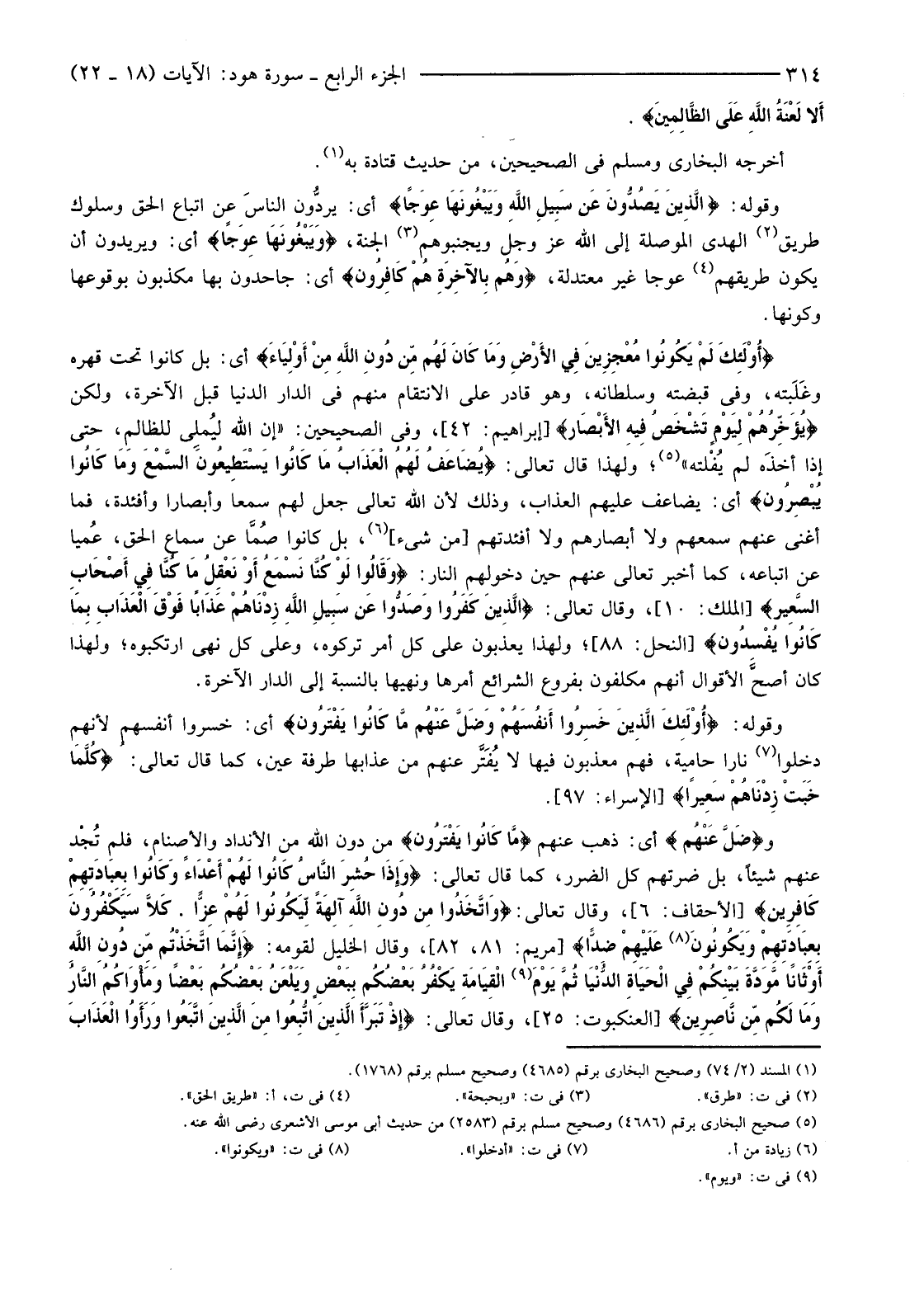 وَقَوْلُهُ: {الَّذِينَ يَصُدُّونَ عَنْ سَبِيلِ اللَّهِ وَيَبْغُونَهَا عِوَجًا} أَيْ يردُّون الناسَ عَنِ اتِّبَاعِ الْحَقِّ وَسُلُوكِ طَرِيقِ (2) الْهُدَى الْمُوَصِّلَةِ إِلَى اللَّهِ عَزَّ وَجَلَّ وَيُجَنِّبُونَهُمُ (3) الْجَنَّةَ، {وَيَبْغُونَهَا عِوَجًا} أَيْ: وَيُرِيدُونَ أَنْ يَكُونَ طَرِيقُهُمْ (4) عِوَجًا غَيْرَ مُعْتَدِلَةٍ، {وَهُمْ بِالآخِرَةِ هُمْ كَافِرُونَ} أَيْ: جَاحِدُونَ بِهَا مُكَذِّبُونَ بِوُقُوعِهَا وَكَوْنِهَا.