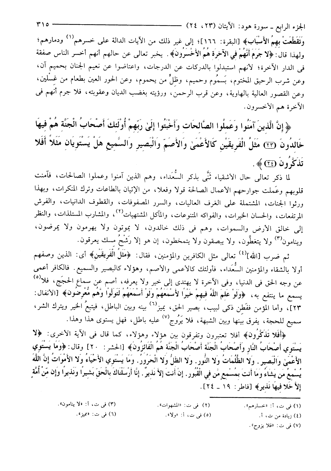 {إِنَّ الَّذِينَ آمَنُوا وَعَمِلُوا الصَّالِحَاتِ وَأَخْبَتُوا إِلَى رَبِّهِمْ أُولَئِكَ أَصْحَابُ الْجَنَّةِ هُمْ فِيهَا خَالِدُونَ (23) مَثَلُ الْفَرِيقَيْنِ كَالأعْمَى وَالأصَمِّ وَالْبَصِيرِ وَالسَّمِيعِ هَلْ يَسْتَوِيَانِ مَثَلا أَفَلا تَذَكَّرُونَ (24) }