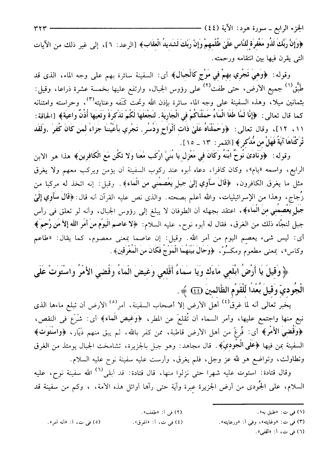 يُخْبِرُ تَعَالَى أَنَّهُ لَمَّا غَرِقَ (4) أَهْلُ الْأَرْضِ إِلَّا أَصْحَابَ السَّفِينَةِ، أَمَرَ (5) الْأَرْضَ أَنْ تَبْلَعَ مَاءَهَا الَّذِي نَبَعَ مِنْهَا وَاجْتَمَعَ عَلَيْهَا، وَأَمَرَ السَّمَاءَ أَنْ تُقلعَ عَنِ الْمَطَرِ، {وَغِيضَ الْمَاءُ} أَيْ: شَرَعَ فِي النَّقْصِ، {وَقُضِيَ الأمْرُ} أَيْ: فُرغَ مِنْ أَهْلِ الْأَرْضِ قَاطِبَةً، مِمَّنْ كَفَرَ بِاللَّهِ، لَمْ يَبْقَ مِنْهُمْ دَيّار، {وَاسْتَوَتْ} السَّفِينَةُ بِمَنْ فِيهَا {عَلَى الْجُودِيِّ} قَالَ مُجَاهِدٌ: وَهُوَ جَبَلٌ بِالْجَزِيرَةِ، تَشَامَخَتِ الْجِبَالُ يَوْمَئِذٍ مِنَ الْغَرَقِ وَتَطَاوَلَتْ، وَتَوَاضَعَ هُوَ لِلَّهِ عَزَّ وَجَلَّ، فَلَمْ يَغْرَقْ، وَأُرْسَتْ عَلَيْهِ سَفِينَةُ نُوحٍ عَلَيْهِ السَّلَامُ.