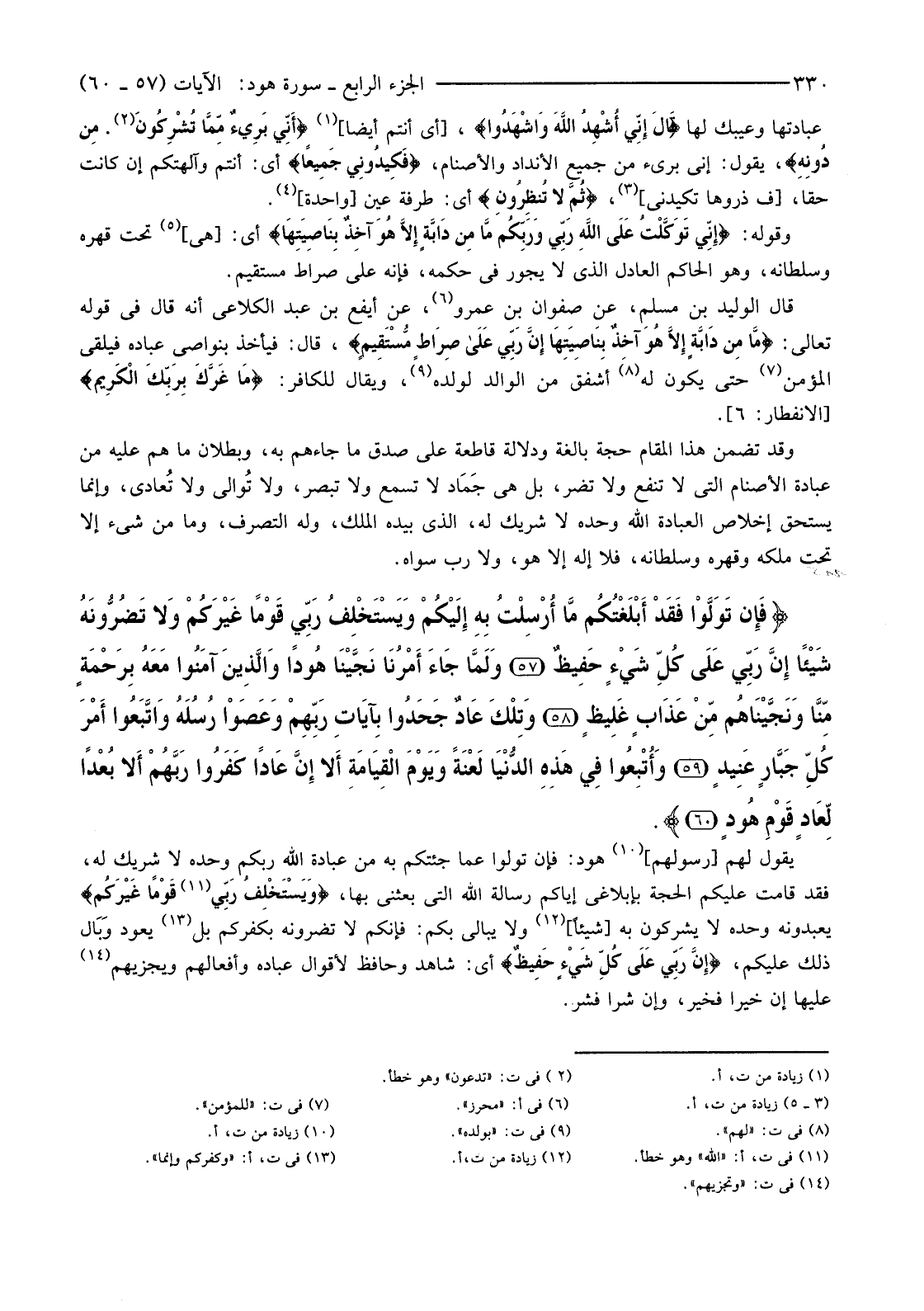 يَقُولُ لَهُمْ [رَسُولُهُمْ] (10) هُودٌ: فَإِنْ تَوَلَّوْا عَمَّا جِئْتُكُمْ بِهِ مِنْ عِبَادَةِ اللَّهِ رَبِّكُمْ وَحْدَهُ لَا شَرِيكَ لَهُ، فَقَدْ قَامَتْ عَلَيْكُمُ الْحُجَّةُ بِإِبْلَاغِي إِيَّاكُمْ رِسَالَةَ اللَّهِ الَّتِي بَعَثَنِي بِهَا، {وَيَسْتَخْلِفُ رَبِّي قَوْمًا غَيْرَكُمْ} (11) يَعْبُدُونَهُ وَحْدَهُ لَا يُشْرِكُونَ بِهِ [شَيْئًا] (12) وَلَا يُبَالِي بِكُمْ: فَإِنَّكُمْ لَا تَضُرُّونَهُ بِكُفْرِكُمْ بَلْ (13) يَعُودُ وَبَال ذَلِكَ عَلَيْكُمْ، {إِنَّ رَبِّي عَلَى كُلِّ شَيْءٍ حَفِيظٌ} أَيْ: شَاهِدٌ وَحَافِظٌ لِأَقْوَالِ عِبَادِهِ وَأَفْعَالِهِمْ وَيَجْزِيهِمْ (14) عَلَيْهَا إِنْ خَيْرًا فَخَيْرٌ، وَإِنْ شَرًّا فَشَرٌّ.