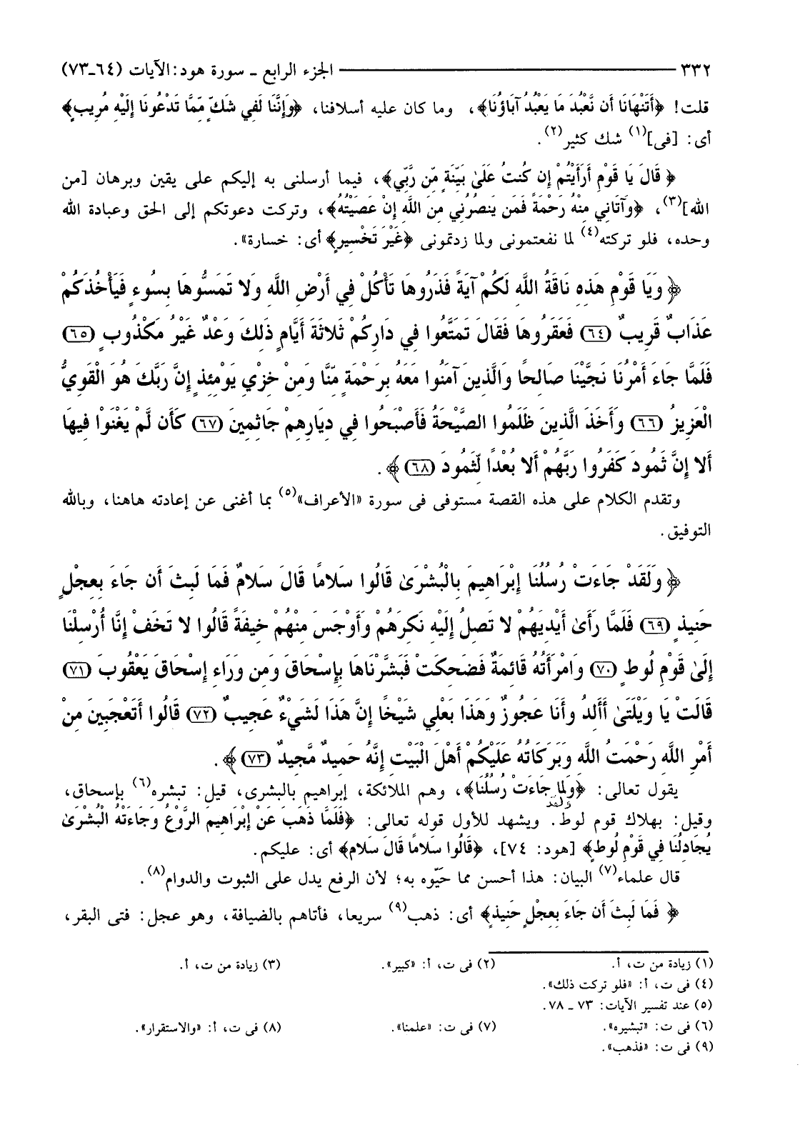{وَلَقَدْ جَاءَتْ رُسُلُنَا إِبْرَاهِيمَ بِالْبُشْرَى قَالُوا سَلامًا قَالَ سَلامٌ فَمَا لَبِثَ أَنْ جَاءَ بِعِجْلٍ حَنِيذٍ (69) فَلَمَّا رَأَى أَيْدِيَهُمْ لَا تَصِلُ إِلَيْهِ نَكِرَهُمْ وَأَوْجَسَ مِنْهُمْ خِيفَةً قَالُوا لَا تَخَفْ إِنَّا أُرْسِلْنَا إِلَى قَوْمِ لُوطٍ (70) وَامْرَأَتُهُ قَائِمَةٌ فَضَحِكَتْ فَبَشَّرْنَاهَا بِإِسْحَاقَ وَمِنْ وَرَاءِ إِسْحَاقَ يَعْقُوبَ (71) }