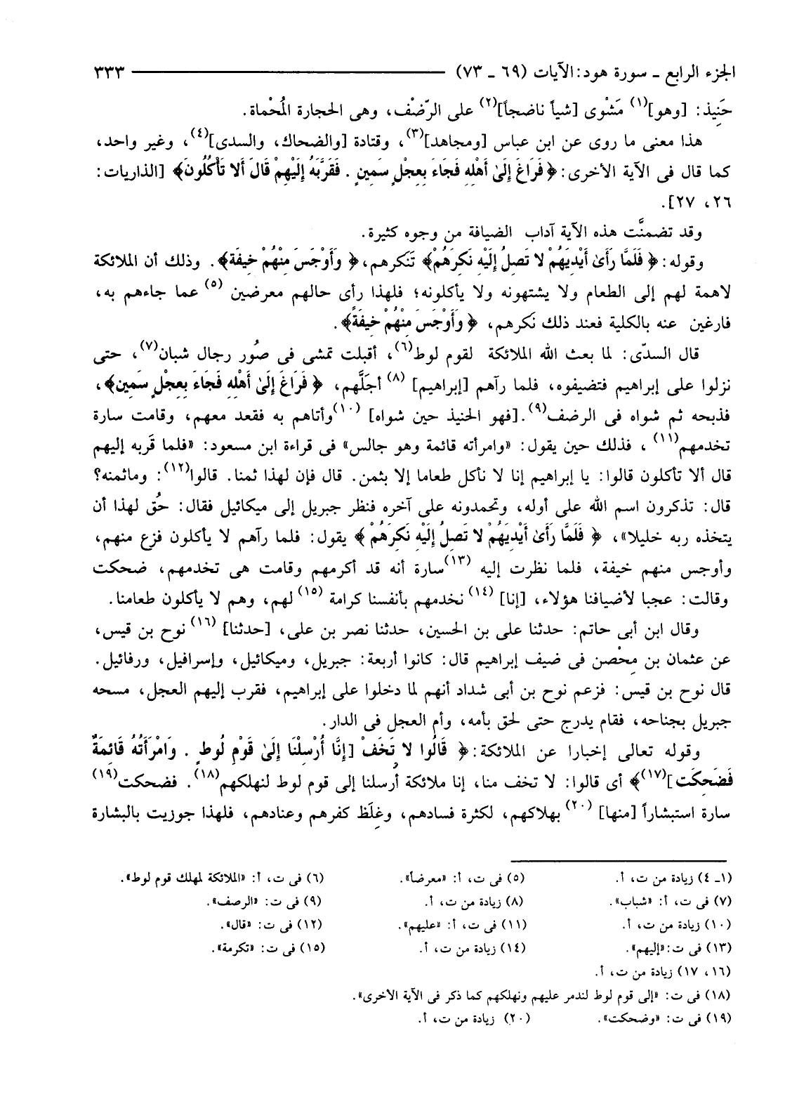 قَالَ السُّدِّيُّ: لَمَّا بَعَثَ اللَّهُ الْمَلَائِكَةَ لِقَوْمِ لُوطٍ (6) أَقْبَلَتْ تَمْشِي فِي صُور رِجَالٍ شُبَّانٍ (7) حَتَّى نَزَلُوا عَلَى إِبْرَاهِيمَ فَتَضَيَّفُوهُ، فَلَمَّا رَآهُمْ [إِبْرَاهِيمُ] (8) أجَلَّهم، {فَرَاغَ إِلَى أَهْلِهِ فَجَاءَ بِعِجْلٍ سَمِينٍ} فَذَبَحَهُ ثُمَّ شَوَاهُ فِي الرَّضْفِ (9) . [فَهُوَ الْحَنِيدُ حِينَ شَوَاهُ] (10) وَأَتَاهُمْ بِهِ فَقَعَدَ مَعَهُمْ، وَقَامَتْ سَارَّةُ تَخْدِمُهُمْ (11) فَذَلِكَ حِينَ يَقُولُ: "وَاِمْرَأَتُهُ قَائِمَةٌ وَهُوَ جَالِسٌ" فِي قِرَاءَةِ ابْنِ مَسْعُودٍ: "فَلَمَّا قَربه إِلَيْهِمْ قَالَ أَلَا تَأْكُلُونَ قَالُوا: يَا إِبْرَاهِيمُ إِنَّا لَا نَأْكُلُ طَعَامًا إِلَّا بِثَمَنٍ. قَالَ فَإِنَّ لِهَذَا ثَمَنًا. قَالُوا (12) وَمَا ثَمَنُهُ؟ قَالَ: تَذْكُرُونَ اسْمَ اللَّهِ عَلَى أَوَّلِهِ، وَتَحْمَدُونَهُ عَلَى آخِرِهِ فَنَظَرَ جِبْرِيلُ إِلَى مِيكَائِيلَ فَقَالَ: حُق لِهَذَا أَنْ يَتَّخِذَهُ رَبُّهُ خَلِيلًا"، {فَلَمَّا رَأَى أَيْدِيَهُمْ لَا تَصِلُ إِلَيْهِ نَكِرَهُمْ} يَقُولُ: فَلَمَّا رَآهُمْ لَا يَأْكُلُونَ فَزِعَ مِنْهُمْ، وَأَوْجَسَ مِنْهُمْ خِيفَةً، فَلَمَّا نَظَرَتْ إِلَيْهِ (13) سَارَّةُ أَنَّهُ قَدْ أَكْرَمَهُمْ وَقَامَتْ هِيَ تَخْدِمُهُمْ، ضَحِكَتْ وَقَالَتْ: عَجَبًا لِأَضْيَافِنَا هَؤُلَاءِ، [إِنَّا] (14) نَخْدِمُهُمْ بِأَنْفُسِنَا كَرَامَةً (15) لَهُمْ، وَهُمْ لَا يَأْكُلُونَ طَعَامَنَا.
