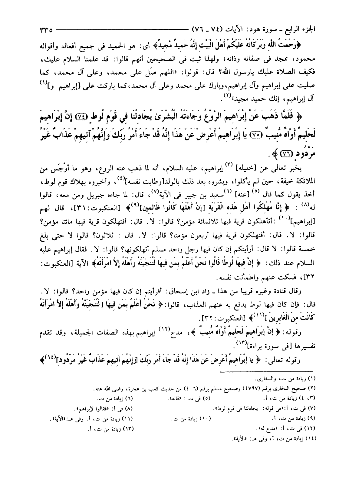 {فَلَمَّا ذَهَبَ عَنْ إِبْرَاهِيمَ الرَّوْعُ وَجَاءَتْهُ الْبُشْرَى يُجَادِلُنَا فِي قَوْمِ لُوطٍ (74) إِنَّ إِبْرَاهِيمَ لَحَلِيمٌ أَوَّاهٌ مُنِيبٌ (75) يَا إِبْرَاهِيمُ أَعْرِضْ عَنْ هَذَا إِنَّهُ قَدْ جَاءَ أَمْرُ رَبِّكَ وَإِنَّهُمْ آتِيهِمْ عَذَابٌ غَيْرُ مَرْدُودٍ (76) }
