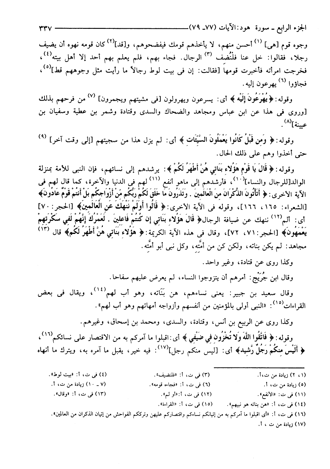 وُجُوهَ قَوْمٍ [هِيَ] (1) أَحْسَنُ مِنْهُمْ، لَا يَأْخُذُهُمْ قَوْمُكَ فَيَفْضَحُوهُمْ، و [قَدْ] (2) كَانَ قَوْمُهُ نَهَوْهُ أَنْ يُضِيفَ رَجُلًا فَقَالُوا: خَلِّ عَنَّا فلْنُضِف (3) الرِّجَالَ. فَجَاءَ بِهِمْ، فَلَمْ يَعْلَمْ بِهِمْ أَحَدٌ إِلَّا أَهْلُ بَيْتِهِ (4) فَخَرَجَتِ امْرَأَتُهُ فَأَخْبَرَتْ قَوْمَهَا [فَقَالَتْ: إِنْ فِي بَيْتِ لُوطٍ رِجَالًا مَا رَأَيْتُ مِثْلَ وُجُوهِهِمْ قَطُّ] (5) ، فَجَاءُوا (6) يُهْرَعُونَ إِلَيْهِ.