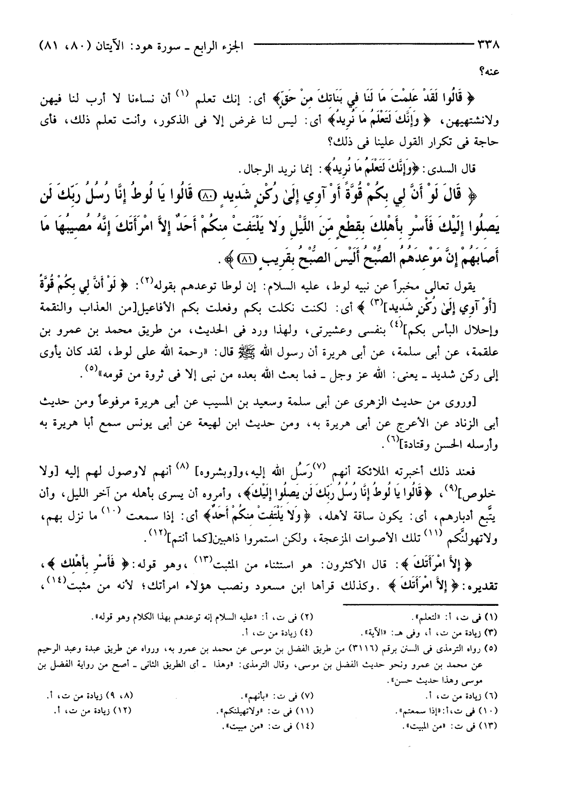 فَعِنْدَ ذَلِكَ أَخْبَرَتْهُ الْمَلَائِكَةُ أَنَّهُمْ (7) رُسل اللَّهِ إِلَيْهِ، و [وَبَشَّرُوهُ] (8) أَنَّهُمْ لَا وُصُولَ لهم إليه [ولا خلوص] (9) {قَالُوا يَا لُوطُ إِنَّا رُسُلُ رَبِّكَ لَنْ يَصِلُوا إِلَيْكَ} وَأَمَرُوهُ أَنْ يَسْرِيَ بِأَهْلِهِ مِنْ آخِرِ اللَّيْلِ، وَأَنْ يتَّبع أَدْبَارَهُمْ، أَيْ: يَكُونُ سَاقَةً لِأَهْلِهِ، {وَلا يَلْتَفِتْ مِنْكُمْ أَحَدٌ} أَيْ: إِذَا سَمِعْتَ (10) مَا نَزلَ بِهِمْ، وَلَا تهولنَّكم (11) تِلْكَ الْأَصْوَاتُ الْمُزْعِجَةُ، وَلَكِنِ اسْتَمِرُّوا ذَاهِبِينَ [كَمَا أَنْتُمْ] (12) .