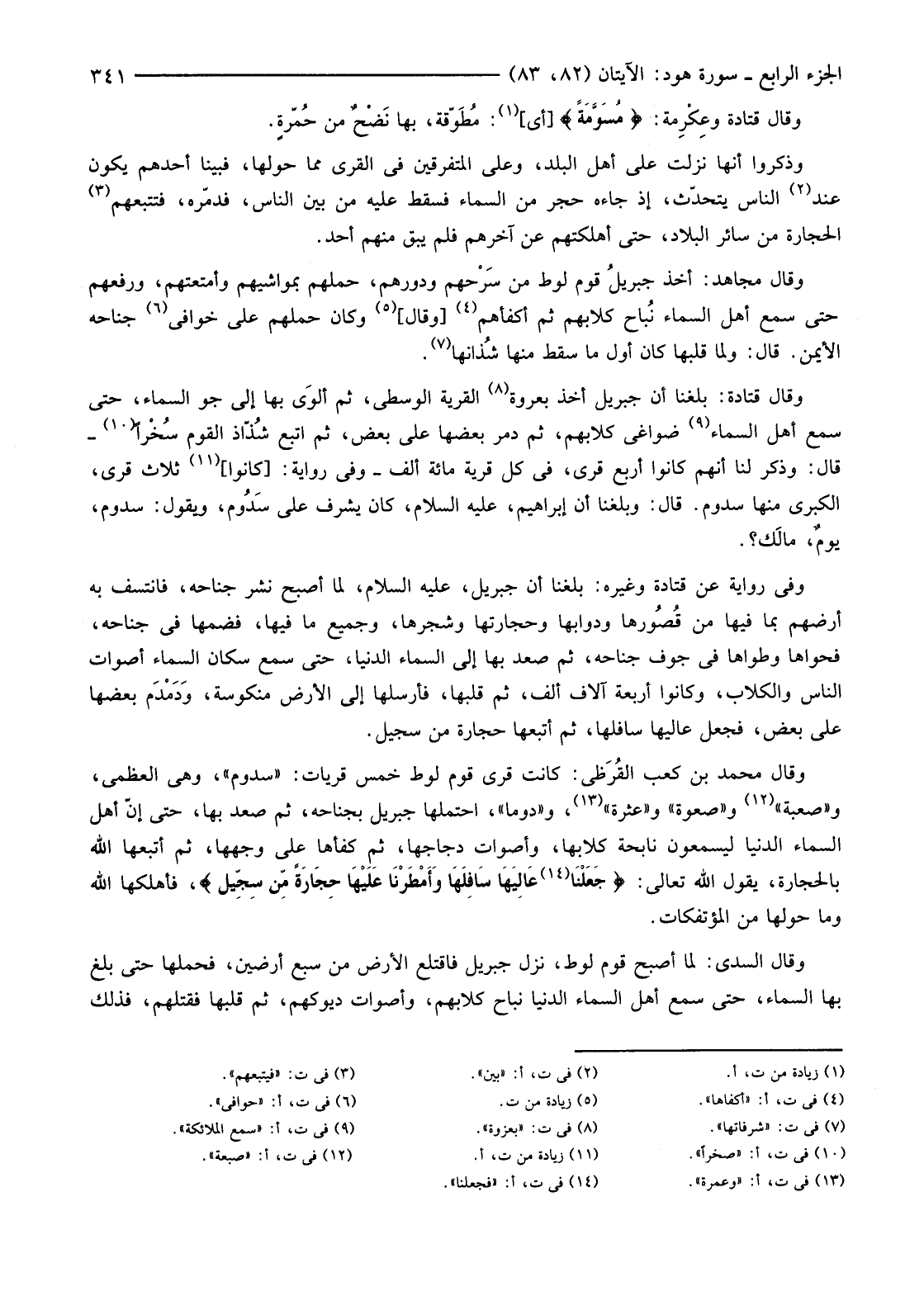 وَفِي رِوَايَةٍ عَنْ قَتَادَةَ وَغَيْرِهِ: بَلَغَنَا أَنَّ جِبْرِيلَ عَلَيْهِ السَّلَامُ، لَمَّا أَصْبَحَ نَشَرَ جَنَاحَهُ، فَانْتَسَفَ بِهِ أَرْضَهُمْ بِمَا فِيهَا مِنْ قُصُورها وَدَوَابِّهَا وَحِجَارَتِهَا وَشَجَرِهَا، وَجَمِيعِ مَا فِيهَا، فَضَمَّهَا فِي جَنَاحِهِ، فَحَوَاهَا وَطَوَاهَا فِي جَوْفِ جَنَاحِهِ، ثُمَّ صَعِدَ بِهَا إِلَى السَّمَاءِ الدُّنْيَا، حَتَّى سَمِعَ سُكَّانُ السَّمَاءِ أَصْوَاتَ النَّاسِ وَالْكِلَابِ، وَكَانُوا أَرْبَعَةَ آلَافِ أَلْفٍ، ثُمَّ قَلَبَهَا، فَأَرْسَلَهَا إِلَى الْأَرْضِ مَنْكُوسَةً، وَدَمْدَم بَعْضَهَا عَلَى بَعْضٍ، فَجَعَلَ عَالِيَهَا سَافِلَهَا، ثُمَّ أَتْبَعَهَا حِجَارَةً مِنْ سِجِّيلٍ.