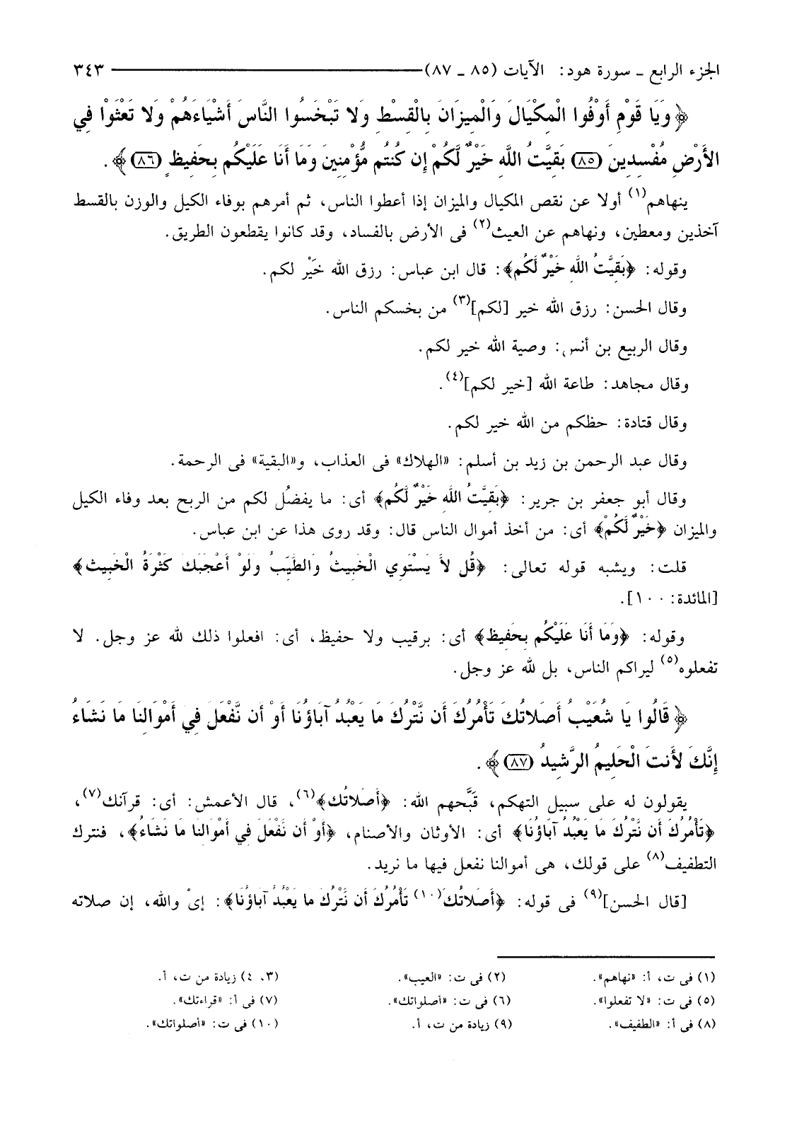 {وَيَا قَوْمِ أَوْفُوا الْمِكْيَالَ وَالْمِيزَانَ بِالْقِسْطِ وَلا تَبْخَسُوا النَّاسَ أَشْيَاءَهُمْ وَلا تَعْثَوْا فِي الأرْضِ مُفْسِدِينَ (85) بَقِيَّةُ اللَّهِ خَيْرٌ لَكُمْ إِنْ كُنْتُمْ مُؤْمِنِينَ وَمَا أَنَا عَلَيْكُمْ بِحَفِيظٍ (86) }