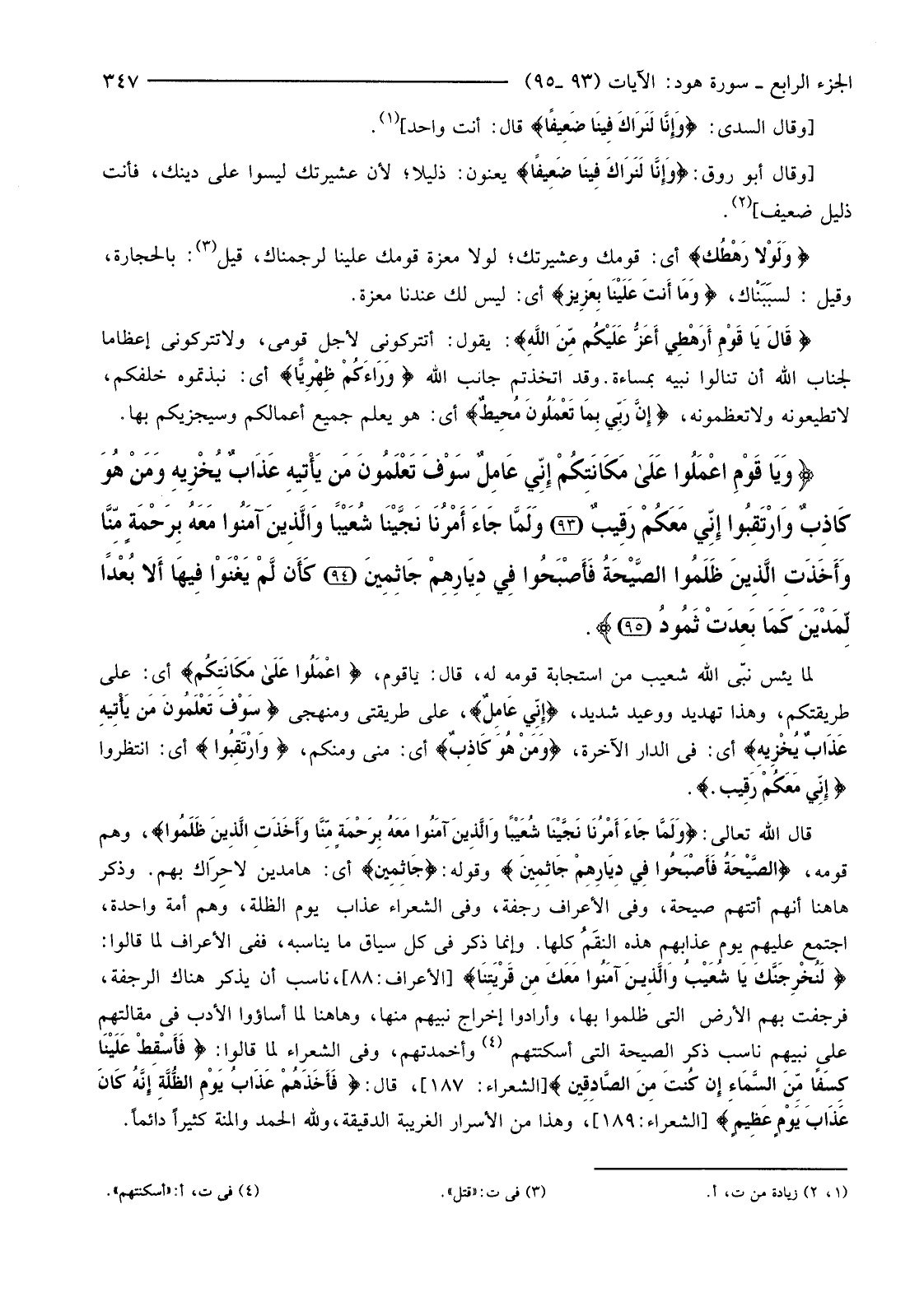 قَالَ اللَّهُ تَعَالَى: {وَلَمَّا جَاءَ أَمْرُنَا نَجَّيْنَا شُعَيْبًا وَالَّذِينَ آمَنُوا مَعَهُ بِرَحْمَةٍ مِنَّا وَأَخَذَتِ الَّذِينَ ظَلَمُوا} وَهُمْ قَوْمُهُ، {الصَّيْحَةُ فَأَصْبَحُوا فِي دِيَارِهِمْ جَاثِمِينَ} وَقَوْلُهُ {جَاثمِيِنَ} أَيْ: هَامِدَيْنِ لَا حِرَاك بِهِمْ. وَذَكَرَ هَاهُنَا أَنَّهُ أَتَتْهُمْ صَيْحَةٌ، وَفِي الْأَعْرَافِ رَجْفَةٌ، وَفِي الشُّعَرَاءِ عَذَابُ يَوْمِ الظُّلَّةِ، وَهُمْ أُمَّةٌ وَاحِدَةٌ، اجْتَمَعَ عَلَيْهِمْ يَوْمَ عَذَابِهِمْ هَذِهِ النقَمُ كُلُّهَا. وَإِنَّمَا ذَكَرَ فِي كُلِّ سِيَاقٍ مَا يُنَاسِبُهُ، فَفِي الْأَعْرَافِ لَمَّا قَالُوا: {لَنُخْرِجَنَّكَ يَا شُعَيْبُ وَالَّذِينَ آمَنُوا مَعَكَ مِنْ قَرْيَتِنَا} [الْأَعْرَافِ:88] ، نَاسَبَ أَنْ يَذْكُرَ هُنَاكَ الرَّجْفَةَ، فَرُجِفَتْ بِهِمُ الْأَرْضُ الَّتِي ظَلَمُوا بِهَا، وَأَرَادُوا إِخْرَاجَ نَبِيِّهُمْ مِنْهَا، وَهَاهُنَا لَمَّا أَسَاءُوا الْأَدَبَ فِي مَقَالَتِهِمْ عَلَى نَبِيِّهِمْ نَاسَبَ ذِكْرَ الصَّيْحَةِ الَّتِي أَسْكَتَتْهُمْ (4) وَأَخْمَدَتْهُمْ، وَفِي الشُّعَرَاءِ لَمَّا قَالُوا: {فَأَسْقِطْ عَلَيْنَا كِسَفًا مِنَ السَّمَاءِ إِنْ كُنْتَ مِنَ الصَّادِقِينَ} [الشُّعَرَاءِ:189] ، قَالَ {فَأَخَذَهُمْ عَذَابُ يَوْمِ الظُّلَّةِ إِنَّهُ كَانَ عَذَابَ يَوْمٍ عَظِيمٍ} [الشُّعَرَاءِ:189] ، وَهَذَا مِنَ الْأَسْرَارِ الْغَرِيبَةِ الدَّقِيقَةِ، وَلِلَّهِ الْحَمْدُ وَالْمِنَّةُ كَثِيرًا دَائِمًا.