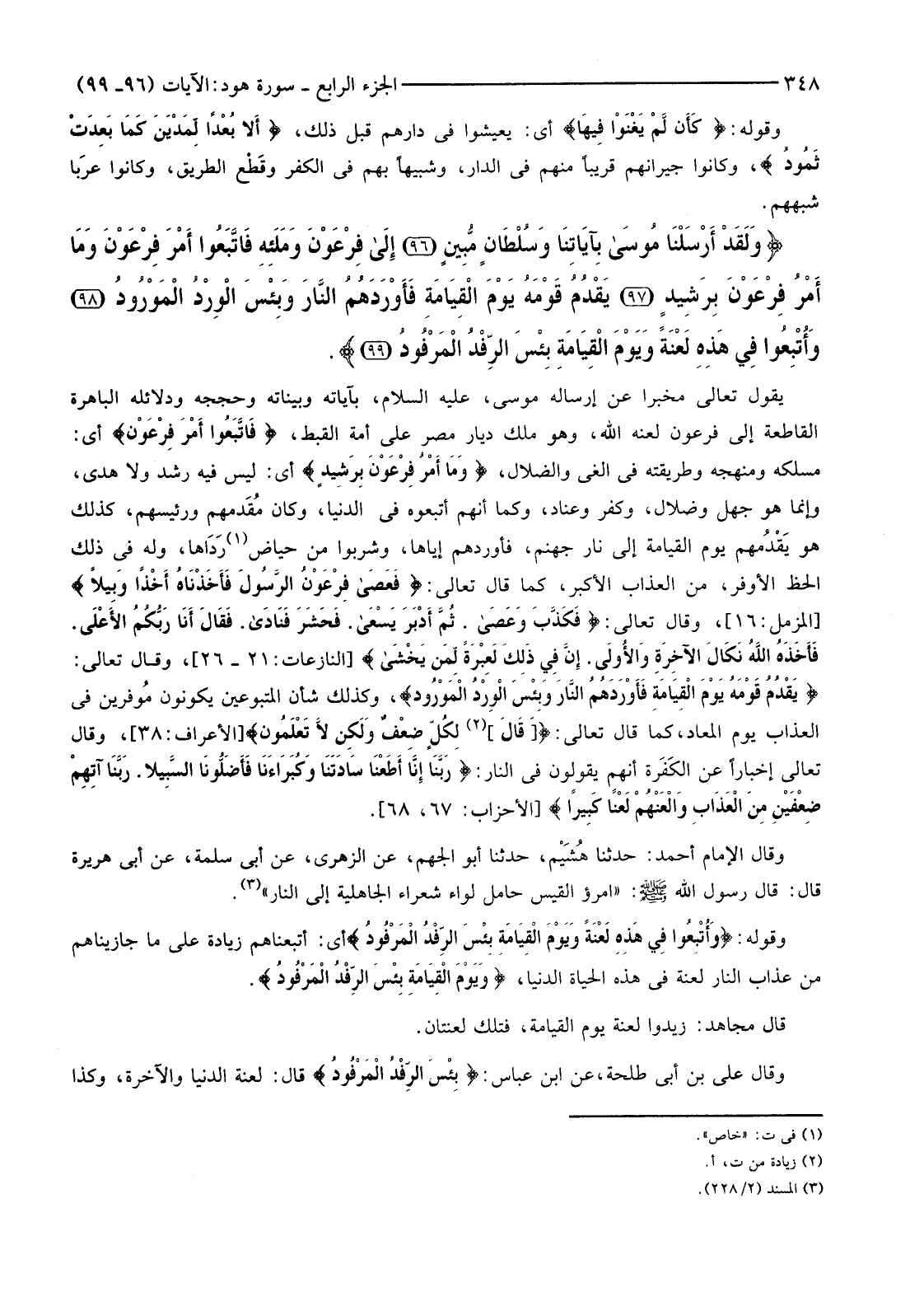 {يَقْدُمُ قَوْمَهُ يَوْمَ الْقِيَامَةِ فَأَوْرَدَهُمُ النَّارَ وَبِئْسَ الْوِرْدُ الْمَوْرُودُ (98) وَأُتْبِعُوا فِي هَذِهِ لَعْنَةً وَيَوْمَ الْقِيَامَةِ بِئْسَ الرِّفْدُ الْمَرْفُودُ (99) }