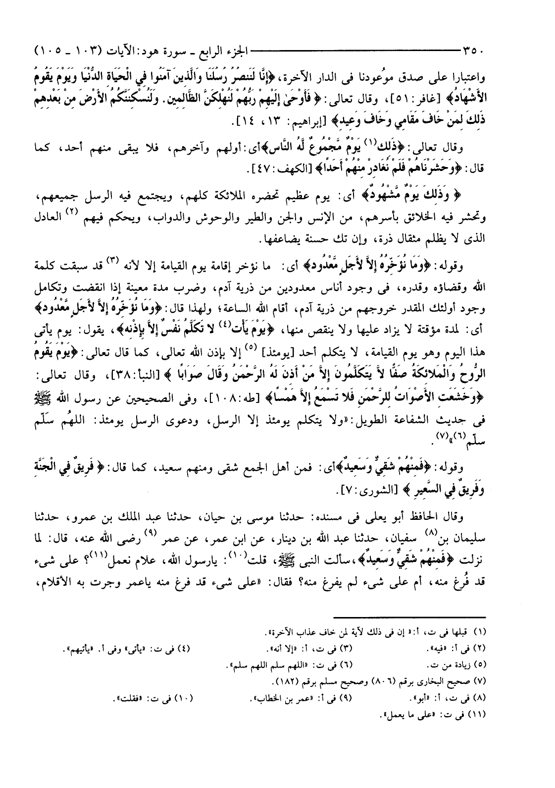 وَقَوْلُهُ: {وَمَا نُؤَخِّرُهُ إِلا لأجَلٍ مَعْدُودٍ} أَيْ: مَا نُؤَخِّرُ إِقَامَةَ يَوْمِ الْقِيَامَةِ إِلَّا لِأَنَّهُ (3) قَدْ سَبَقَتْ كَلِمَةُ اللَّهِ وَقَضَاؤُهُ وَقَدَرُهُ، فِي وُجُودِ أُنَاسٍ مَعْدُودِينَ مِنْ ذُرِّيَّةِ آدَمَ، وَضَرَبَ مُدَّةً مُعَيَّنَةً إِذَا انْقَضَتْ وَتَكَامَلَ وُجُودُ أُولَئِكَ الْمُقَدَّرِ خُرُوجُهُمْ مِنْ ذُرِّيَّةِ آدَمَ، أَقَامَ اللَّهُ السَّاعَةَ؛ وَلِهَذَا قَالَ: {وَمَا نُؤَخِّرُهُ إِلا لأجَلٍ مَعْدُودٍ} أَيْ: لِمُدَّةٍ مُؤَقَّتَةٍ لَا يُزَادُ عَلَيْهَا وَلَا يُنْتَقَصُ مِنْهَا، {يَوْمَ يَأْتِ لَا تَكَلَّمُ نَفْسٌ إِلا بِإِذْنِهِ} (4) يَقُولُ: يَوْمَ يَأْتِي هَذَا الْيَوْمُ وَهُوَ يَوْمُ الْقِيَامَةِ، لَا يَتَكَلَّمُ أَحَدٌ [يَوْمَئِذٍ] (5) إِلَّا بِإِذْنِ اللَّهِ تَعَالَى، كَمَا قَالَ تَعَالَى: {يَوْمَ يَقُومُ الرُّوحُ وَالْمَلائِكَةُ صَفًّا لَا يَتَكَلَّمُونَ إِلا مَنْ أَذِنَ لَهُ الرَّحْمَنُ وَقَالَ صَوَابًا} [النَّبَأِ:38] ، وَقَالَ تَعَالَى: {وَخَشَعَتِ الأصْوَاتُ لِلرَّحْمَنِ فَلا تَسْمَعُ إِلا هَمْسًا} [طَهَ:108] ، وَفِي الصَّحِيحَيْنِ عَنْ رَسُولِ اللَّهِ صَلَّى اللَّهُ عَلَيْهِ وَسَلَّمَ فِي حَدِيثِ الشَّفَاعَةِ الطَّوِيلِ: "وَلَا يَتَكَلَّمُ يَوْمَئِذٍ إِلَّا الرُّسُلُ، وَدَعْوَى الرُّسُلِ يَوْمَئِذٍ: اللهُم سَلّم سَلِّمْ (6) (7) .
