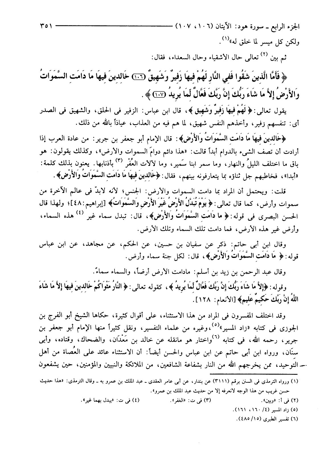 وَقَدِ اخْتَلَفَ الْمُفَسِّرُونَ فِي الْمُرَادِ مِنْ هَذَا الِاسْتِثْنَاءِ، عَلَى أَقْوَالٍ كَثِيرَةٍ، حَكَاهَا الشَّيْخُ أَبُو الْفَرَجِ بْنُ الْجَوْزِيِّ فِي كِتَابِهِ "زَادُ الْمَسِيرِ" (5) وَغَيْرُهُ مِنْ عُلَمَاءِ التَّفْسِيرِ، وَنَقَلَ كَثِيرًا مِنْهَا الْإِمَامُ أَبُو جَعْفَرِ بْنُ جَرِيرٍ، رَحِمَهُ اللَّهُ، فِي كِتَابِهِ (6) وَاخْتَارَ هُوَ مَا نَقَلَهُ عَنْ خَالِدِ بْنِ مَعْدَان، وَالضَّحَّاكِ، وَقَتَادَةَ، وَأَبِي سِنَان، وَرَوَاهُ ابْنُ أَبِي حَاتِمٍ عَنِ ابْنِ عَبَّاسٍ وَالْحَسَنِ أَيْضًا: أَنَّ الِاسْتِثْنَاءَ عَائِدٌ عَلَى العُصاة مِنْ أَهْلِ التَّوْحِيدِ، مِمَّنْ يُخْرِجُهُمُ اللَّهُ مِنَ النَّارِ بِشَفَاعَةِ الشافعين، من الملائكة والنبيين والمؤمنين،