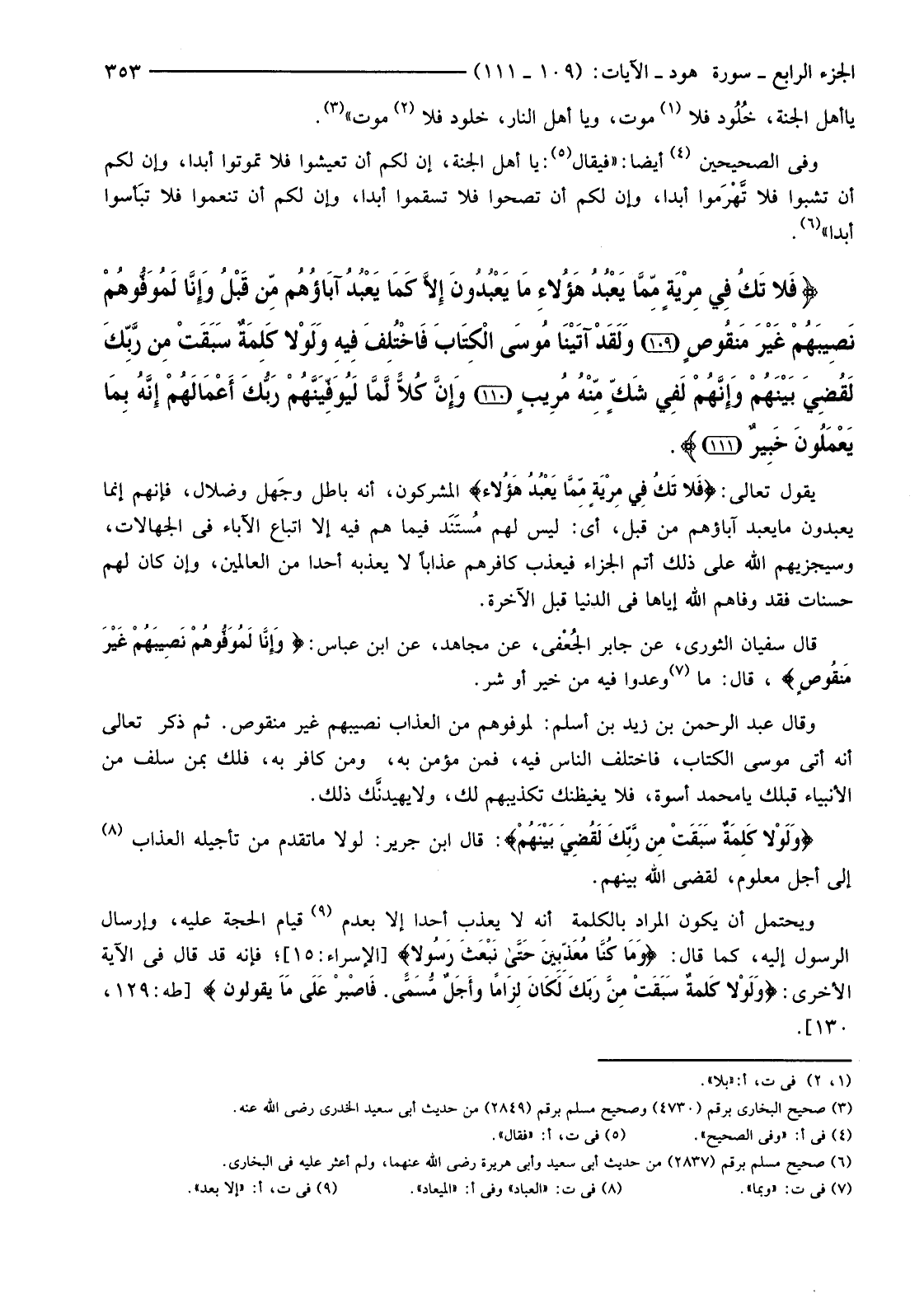{فَلا تَكُ فِي مِرْيَةٍ مِمَّا يَعْبُدُ هَؤُلاءِ مَا يَعْبُدُونَ إِلا كَمَا يَعْبُدُ آبَاؤُهُمْ مِنْ قَبْلُ وَإِنَّا لَمُوَفُّوهُمْ نَصِيبَهُمْ غَيْرَ مَنْقُوصٍ (109) وَلَقَدْ آتَيْنَا مُوسَى الْكِتَابَ فَاخْتُلِفَ فِيهِ وَلَوْلا كَلِمَةٌ سَبَقَتْ مِنْ رَبِّكَ لَقُضِيَ بَيْنَهُمْ وَإِنَّهُمْ لَفِي شَكٍّ مِنْهُ مُرِيبٍ (110) وَإِنَّ كُلا لَمَّا لَيُوَفِّيَنَّهُمْ رَبُّكَ أَعْمَالَهُمْ إِنَّهُ بِمَا يَعْمَلُونَ خَبِيرٌ (111) }