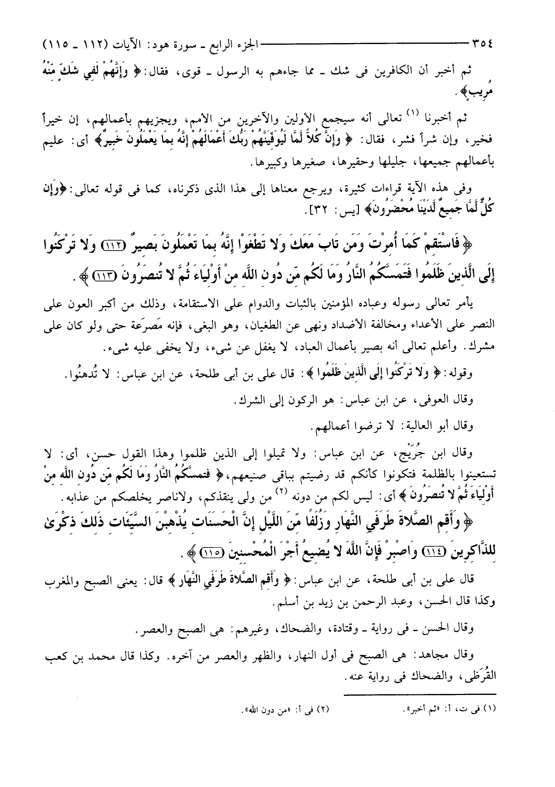 {فَاسْتَقِمْ كَمَا أُمِرْتَ وَمَنْ تَابَ مَعَكَ وَلا تَطْغَوْا إِنَّهُ بِمَا تَعْمَلُونَ بَصِيرٌ (112) وَلا تَرْكَنُوا إِلَى الَّذِينَ ظَلَمُوا فَتَمَسَّكُمُ النَّارُ وَمَا لَكُمْ مِنْ دُونِ اللَّهِ مِنْ أَوْلِيَاءَ ثُمَّ لَا تُنْصَرُونَ (113) }