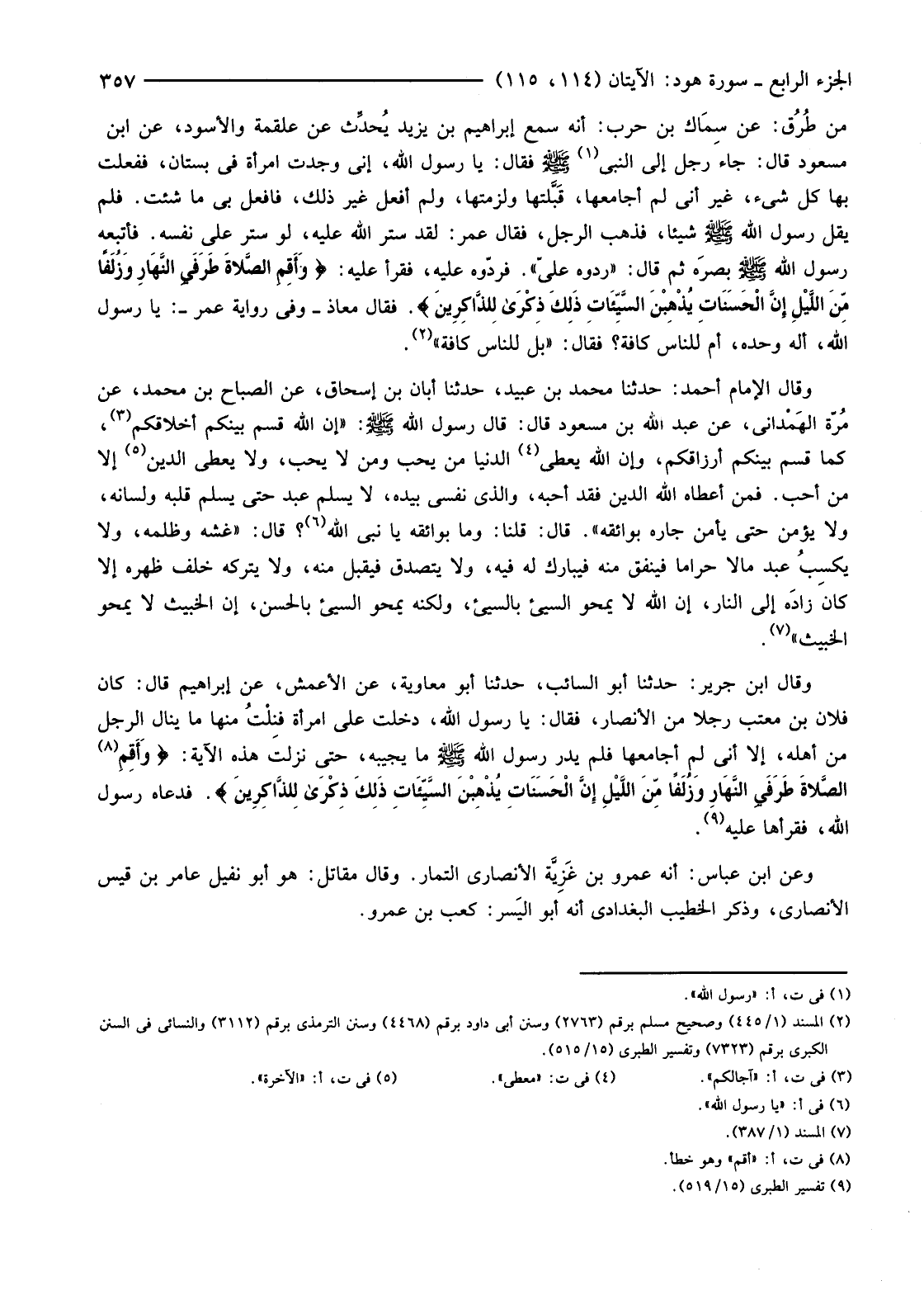 مِنْ طُرُق: عَنْ سِمَاك بْنِ حَرْبٍ: أَنَّهُ سَمِعَ إِبْرَاهِيمَ بْنَ يَزِيدَ يُحدِّث عَنْ عَلْقَمَةَ وَالْأَسْوَدِ، عَنِ ابْنِ مَسْعُودٍ قَالَ: جَاءَ رَجُلٌ إِلَى النَّبِيِّ (1) صَلَّى اللَّهُ عَلَيْهِ وَسَلَّمَ فَقَالَ: يَا رَسُولَ اللَّهِ، إِنِّي وَجَدْتُ امْرَأَةً فِي بُسْتَانٍ، فَفَعَلْتُ بِهَا كُلَّ شَيْءٍ، غَيْرَ أَنِّي لَمْ أُجَامِعْهَا، قَبَّلتها وَلَزِمْتُهَا، وَلَمْ أَفْعَلْ غَيْرَ ذَلِكَ، فَافْعَلْ بِي مَا شِئْتَ. فَلَمْ يَقُلْ رَسُولِ اللَّهِ صَلَّى اللَّهُ عَلَيْهِ وَسَلَّمَ شَيْئًا، فَذَهَبَ الرَّجُلُ، فَقَالَ عُمَرُ: لَقَدْ سَتَرَ اللَّهُ عَلَيْهِ، لَوْ سَتَرَ عَلَى نَفْسِهِ. فَأَتْبَعُهُ رَسُولُ اللَّهِ صَلَّى اللَّهُ عَلَيْهِ وَسَلَّمَ بصرَه ثُمَّ قَالَ: "رُدُّوهُ عَلَيَّ". فَرَدُّوهُ عَلَيْهِ، فَقَرَأَ عَلَيْهِ: {وَأَقِمِ الصَّلاةَ طَرَفَيِ النَّهَارِ وَزُلَفًا مِنَ اللَّيْلِ إِنَّ الْحَسَنَاتِ يُذْهِبْنَ السَّيِّئَاتِ ذَلِكَ ذِكْرَى لِلذَّاكِرِينَ} فَقَالَ مُعَاذٌ -وَفِي رِوَايَةِ عُمَرَ -: يَا رَسُولَ اللَّهِ، أَلَهُ وَحْدَهُ، أَمْ لِلنَّاسِ كَافَّةً؟ فَقَالَ: "بَلْ لِلنَّاسِ كَافَّةً" (2) .