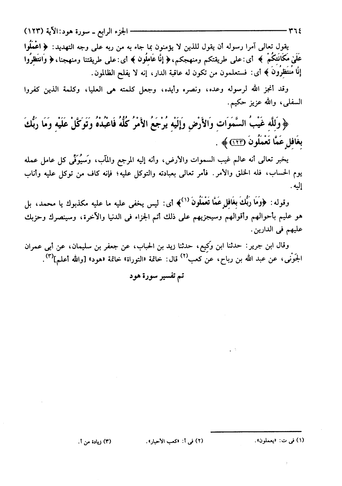 وَقَوْلُهُ: {وَمَا رَبُّكَ بِغَافِلٍ عَمَّا تَعْمَلُونَ} (1) أَيْ: لَيْسَ يَخْفَى عَلَيْهِ مَا عَلَيْهِ مُكَذِّبُوكَ يَا مُحَمَّدُ، بَلْ هُوَ عَلِيمٌ بِأَحْوَالِهِمْ وَأَقْوَالِهِمْ وَسَيَجْزِيهِمْ عَلَى ذَلِكَ أَتَمَّ الْجَزَاءَ فِي الدُّنْيَا وَالْآخِرَةِ، وَسَيَنْصُرُكَ وَحِزْبَكَ عَلَيْهِمْ فِي الدَّارَيْنِ. وَقَالَ ابْنُ جَرِيرٍ: حَدَّثَنَا ابْنُ وَكِيع، حَدَّثَنَا زَيْدُ بْنُ الْحُبَابِ، عَنْ جَعْفَرِ بْنِ سُلَيْمَانَ، عَنْ أَبِي عِمْرَانَ الجَوْني، عَنْ عَبْدِ اللَّهِ بْنِ رَبَاحٍ، عَنْ كَعْبٍ (2) قَالَ: خَاتِمَةُ "التَّوْرَاةِ" خَاتِمَةُ "هُودٍ" [وَاللَّهُ أَعْلَمُ] (3) تم تفسير سورة هود.