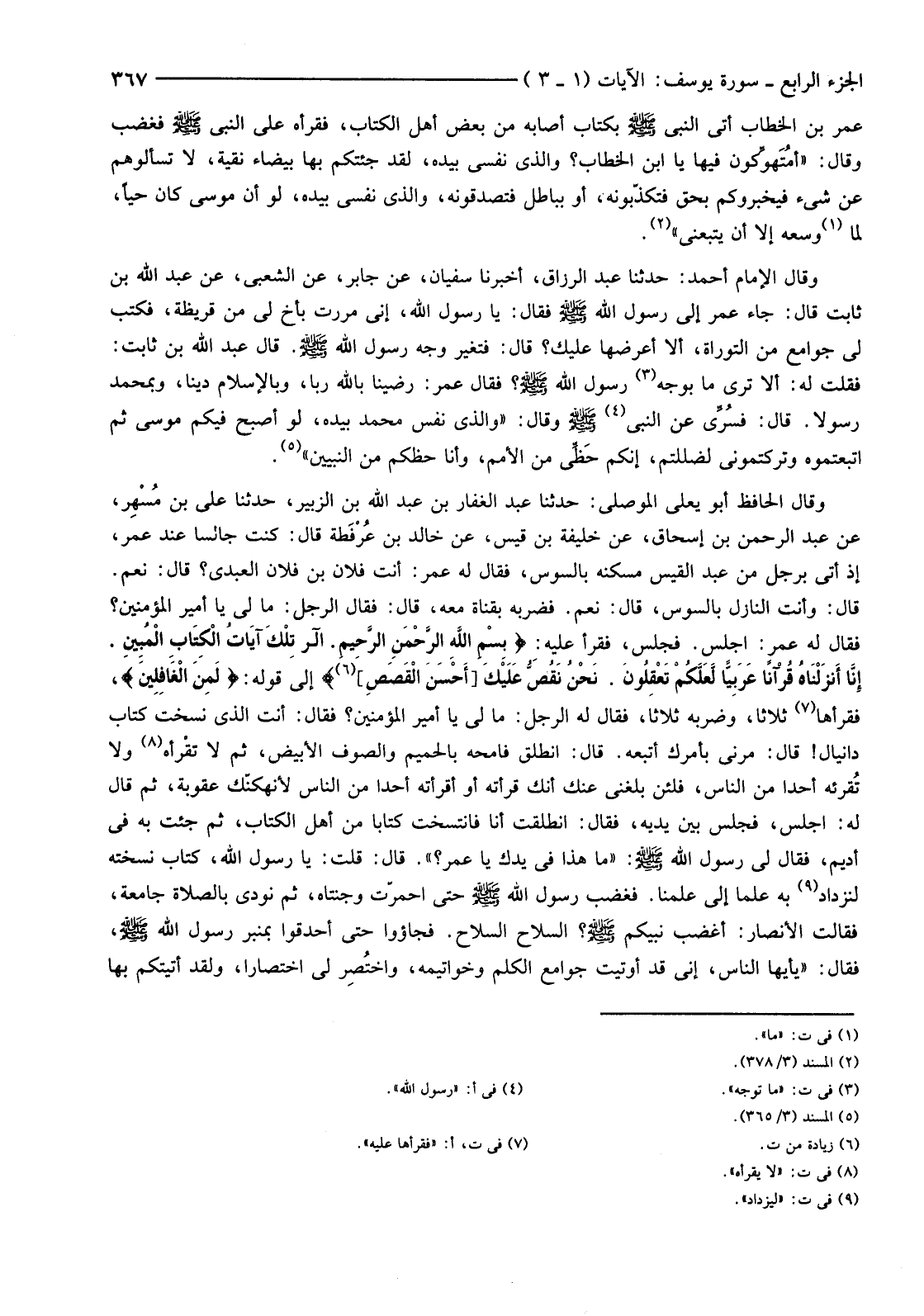 وَقَالَ الْإِمَامُ أَحْمَدُ: حَدَّثَنَا عَبْدُ الرَّزَّاقِ، أَخْبَرَنَا سُفْيَانُ، عَنْ جَابِرٍ، عَنِ الشَّعْبِيِّ، عَنْ عَبْدِ اللَّهِ بْنِ ثَابِتٍ قَالَ: جَاءَ عُمَرُ إِلَى رَسُولِ اللَّهِ صَلَّى اللَّهُ عَلَيْهِ وَسَلَّمَ فَقَالَ: يَا رَسُولَ اللَّهِ، إِنِّي مَرَرْتُ بِأَخٍ لِي مِنْ قُرَيْظَةَ، فَكَتَبَ لِي جَوَامِعَ مِنَ التَّوْرَاةِ، أَلَا أَعْرِضُهَا عَلَيْكَ؟ قَالَ: فَتَغَيَّرَ وَجْهُ رَسُولِ اللَّهِ صَلَّى اللَّهُ عَلَيْهِ وَسَلَّمَ. قَالَ عَبْدُ اللَّهِ بْنُ ثَابِتٍ: فَقُلْتُ لَهُ: أَلَا تَرَى مَا بِوَجْهِ (3) رَسُولِ اللَّهِ صَلَّى اللَّهُ عَلَيْهِ وَسَلَّمَ؟ فَقَالَ عُمَرُ: رَضِينَا بِاللَّهِ رِبَّا، وَبِالْإِسْلَامِ دِينًا، وَبِمُحَمَّدٍ رَسُولًا. قَالَ: فسُرِّي عَنِ النَّبِيِّ (4) صَلَّى اللَّهُ عَلَيْهِ وَسَلَّمَ وَقَالَ: "وَالَّذِي نَفْسُ مُحَمَّدٍ بِيَدِهِ، لَوْ أَصْبَحَ فِيكُمْ مُوسَى ثُمَّ اتَّبَعْتُمُوهُ وَتَرَكْتُمُونِي لَضَلَلْتُمْ، إِنَّكُمْ حَظِّي مِنَ الْأُمَمِ، وَأَنَا حَظُّكُمْ مِنَ النَّبِيِّينَ" (5) .