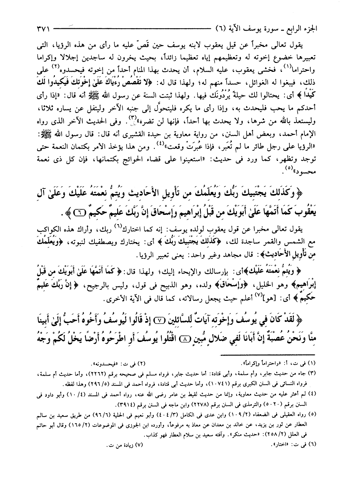 يَقُولُ تَعَالَى مُخْبَرًا عَنْ قَوْلِ يَعْقُوبَ لِابْنِهِ يُوسُفَ حِينَ قَصّ عَلَيْهِ مَا رَأَى مِنْ هَذِهِ الرُّؤْيَا، الَّتِي تَعْبِيرُهَا خُضُوعُ إِخْوَتِهِ لَهُ وَتَعْظِيمُهُمْ إِيَّاهُ تَعْظِيمًا زَائِدًا، بِحَيْثُ يَخِرُّونَ لَهُ سَاجِدِينَ إِجْلَالًا وَإِكْرَامًا وَاحْتِرَامًا (1) فَخَشِيَ يَعْقُوبُ، عَلَيْهِ السَّلَامُ، أَنْ يُحَدِّثَ بِهَذَا الْمَنَامِ أَحَدًا مِنْ إِخْوَتِهِ فَيَحْسُدُوهُ (2) عَلَى ذَلِكَ، فَيَبْغُوا لَهُ الْغَوَائِلَ، حَسَدًا مِنْهُمْ لَهُ؛ وَلِهَذَا قَالَ لَهُ: {لَا تَقْصُصْ رُؤْيَاكَ عَلَى إِخْوَتِكَ فَيَكِيدُوا لَكَ كَيْدًا} أَيْ: يَحْتَالُوا لَكَ حِيلَةً يُرْدُونَك فِيهَا. وَلِهَذَا ثَبَتَتِ السُّنَّةُ عَنْ رَسُولِ اللَّهِ صَلَّى اللَّهُ عَلَيْهِ وَسَلَّمَ أَنَّهُ قَالَ: "إِذَا رَأَى أَحَدُكُمْ مَا يُحِبُّ فَلْيُحَدِّثْ بِهِ، وَإِذَا رَأَى مَا يَكْرَهُ فليتحوَّل إِلَى جَنْبِهِ الْآخَرِ وَلْيَتْفُلْ عَنْ يَسَارِهِ ثَلَاثًا، وَلْيَسْتَعِذْ بِاللَّهِ مِنْ شَرِّهَا، وَلَا يُحَدِّثْ بِهَا أَحَدًا، فَإِنَّهَا لَنْ تَضُرَّهُ" (3) . وَفِي الْحَدِيثِ الْآخَرِ الَّذِي رَوَاهُ الْإِمَامُ أَحْمَدُ، وَبَعْضُ أَهْلِ السُّنَنِ، مِنْ رِوَايَةِ مُعَاوِيَةَ بْنِ حَيْدَةَ الْقُشَيْرِيِّ أَنَّهُ قَالَ: قَالَ رَسُولُ اللَّهِ صَلَّى اللَّهُ عَلَيْهِ وَسَلَّمَ: "الرُّؤْيَا عَلَى رِجْلِ طَائِرٍ مَا لَمْ تُعَبر، فَإِذَا عُبرت وَقَعَتْ" (4) وَمِنْ هَذَا يُؤْخَذُ الْأَمْرُ بِكِتْمَانِ النِّعْمَةِ حَتَّى تُوجَدَ وَتَظْهَرَ، كَمَا وَرَدَ فِي حَدِيثِ: "اسْتَعِينُوا عَلَى قَضَاءِ الْحَوَائِجِ بِكِتْمَانِهَا، فَإِنَّ كُلَّ ذِي نِعْمَةٍ مَحْسُودٌ" (5)
