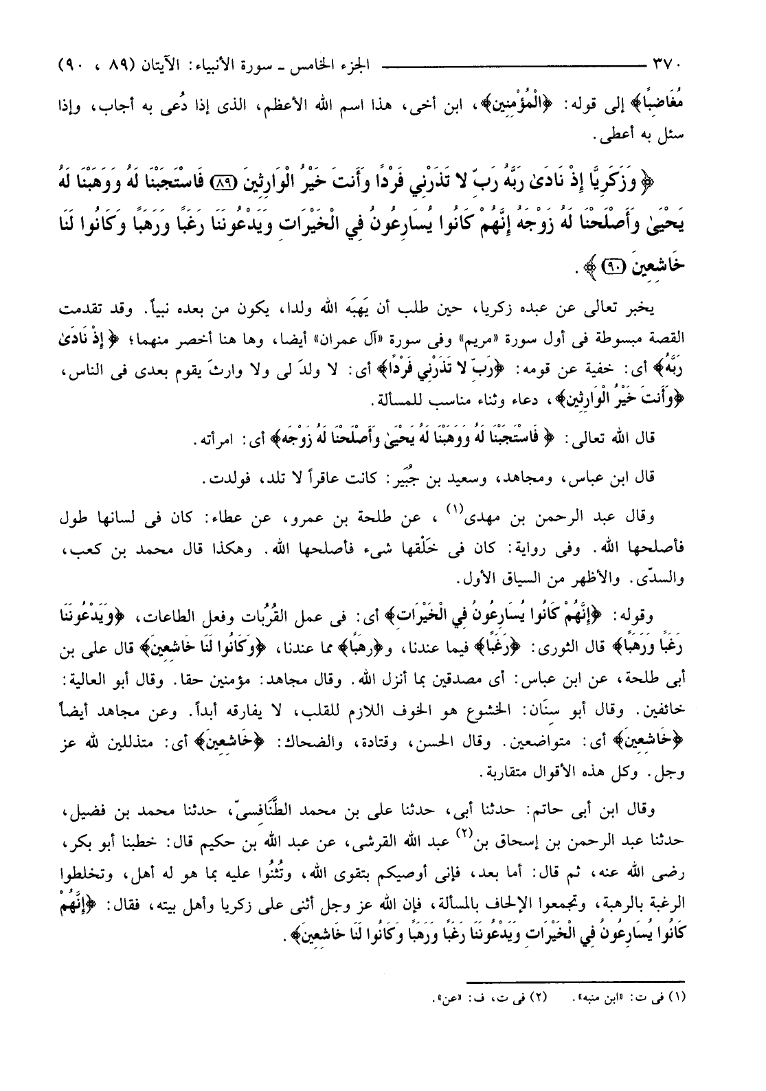 وَقَوْلُهُ: {إِنَّهُمْ كَانُوا يُسَارِعُونَ فِي الْخَيْرَاتِ} أَيْ: فِي عَمَلِ القُرُبات وَفِعْلِ الطَّاعَاتِ، {وَيَدْعُونَنَا رَغَبًا وَرَهَبًا} قَالَ الثَّوْرِيُّ: {رَغَبًا} فِيمَا عِنْدَنَا، {وَرَهَبًا} مِمَّا عِنْدَنَا، {وَكَانُوا لَنَا خَاشِعِينَ} قَالَ عَلِيُّ بْنُ أَبِي طَلْحَةَ، عَنِ ابْنِ عَبَّاسٍ: أَيْ مُصَدِّقِينَ بِمَا أَنْزَلَ اللَّهُ. وَقَالَ مُجَاهِدٌ: مُؤْمِنِينَ حَقًّا. وَقَالَ أَبُو الْعَالِيَةِ: خَائِفِينَ. وَقَالَ أَبُو سِنَان: الْخُشُوعُ هُوَ الْخَوْفُ اللَّازِمُ لِلْقَلْبِ، لَا يُفَارِقُهُ أَبَدًا. وَعَنْ مُجَاهِدٍ أَيْضًا {خَاشِعِينَ} أَيْ: مُتَوَاضِعِينَ. وَقَالَ الْحَسَنُ، وَقَتَادَةُ، وَالضَّحَّاكُ: {خَاشِعِينَ} أَيْ: مُتَذَلِّلِينَ لِلَّهِ عَزَّ وَجَلَّ. وَكُلُّ هَذِهِ الْأَقْوَالِ مُتَقَارِبَةٌ. وَقَالَ ابْنُ أَبِي حَاتِمٍ: حَدَّثَنَا أَبِي، حَدَّثَنَا عَلِيُّ بْنُ مُحَمَّدٍ الطَّنَافِسيّ، حَدَّثَنَا مُحَمَّدُ بْنُ فُضَيْلٍ، حَدَّثَنَا عَبْدُ الرَّحْمَنِ بْنُ إِسْحَاقَ بْنِ (2) عَبْدِ اللَّهِ الْقُرَشِيُّ، عَنْ عَبْدِ اللَّهِ بْنِ حَكِيمٍ قَالَ: خَطَبَنَا أَبُو بَكْرٍ، رَضِيَ اللَّهُ عَنْهُ، ثُمَّ قَالَ: أَمَّا بَعْدُ، فَإِنِّي أُوصِيكُمْ بِتَقْوَى اللَّهِ، وتُثنُوا عَلَيْهِ بِمَا هُوَ لَهُ أَهْلٌ، وَتَخْلِطُوا الرَّغْبَةَ بِالرَّهْبَةِ، وَتَجْمَعُوا الْإِلْحَافَ بِالْمَسْأَلَةِ، فَإِنَّ اللَّهَ عَزَّ وَجَلَّ أَثْنَى عَلَى زَكَرِيَّا وَأَهْلِ بَيْتِهِ، فَقَالَ: {إِنَّهُمْ كَانُوا يُسَارِعُونَ فِي الْخَيْرَاتِ وَيَدْعُونَنَا رَغَبًا وَرَهَبًا وَكَانُوا لَنَا خَاشِعِينَ} .