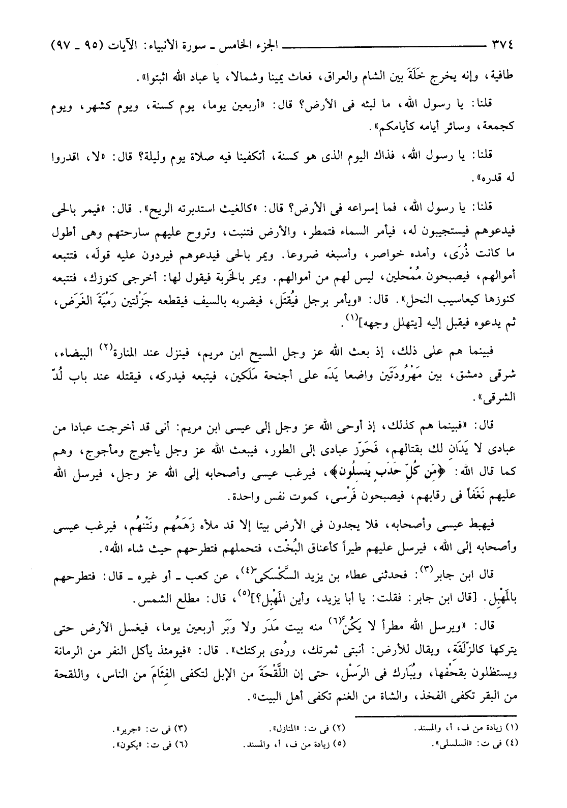 قَالَ: "فَبَيْنَمَا هُمْ كَذَلِكَ، إِذْ أَوْحَى اللَّهُ عَزَّ وَجَلَّ إِلَى عِيسَى ابْنِ مَرْيَمَ: أَنِّي قَدْ أَخْرَجْتُ عِبَادًا مِنْ عِبَادِي لَا يَدَانِ لَكَ بِقِتَالِهِمْ، فَحَوّز عِبَادِي إِلَى الطُّورِ، فَيَبْعَثُ اللَّهُ عَزَّ وَجَلَّ يَأْجُوجَ وَمَأْجُوجَ، وَهُمْ كَمَا قَالَ اللَّهُ: {مِنْ كُلِّ حَدَبٍ يَنْسِلُونَ} فَيَرْغَبُ عِيسَى وَأَصْحَابُهُ إِلَى اللَّهِ عَزَّ وَجَلَّ، فَيُرْسِلُ اللَّهُ عَلَيْهِمْ نَغَفًا فِي رِقَابِهِمْ، فَيُصْبِحُونَ فَرْسى، كَمَوْتِ نَفْسٍ وَاحِدَةٍ.