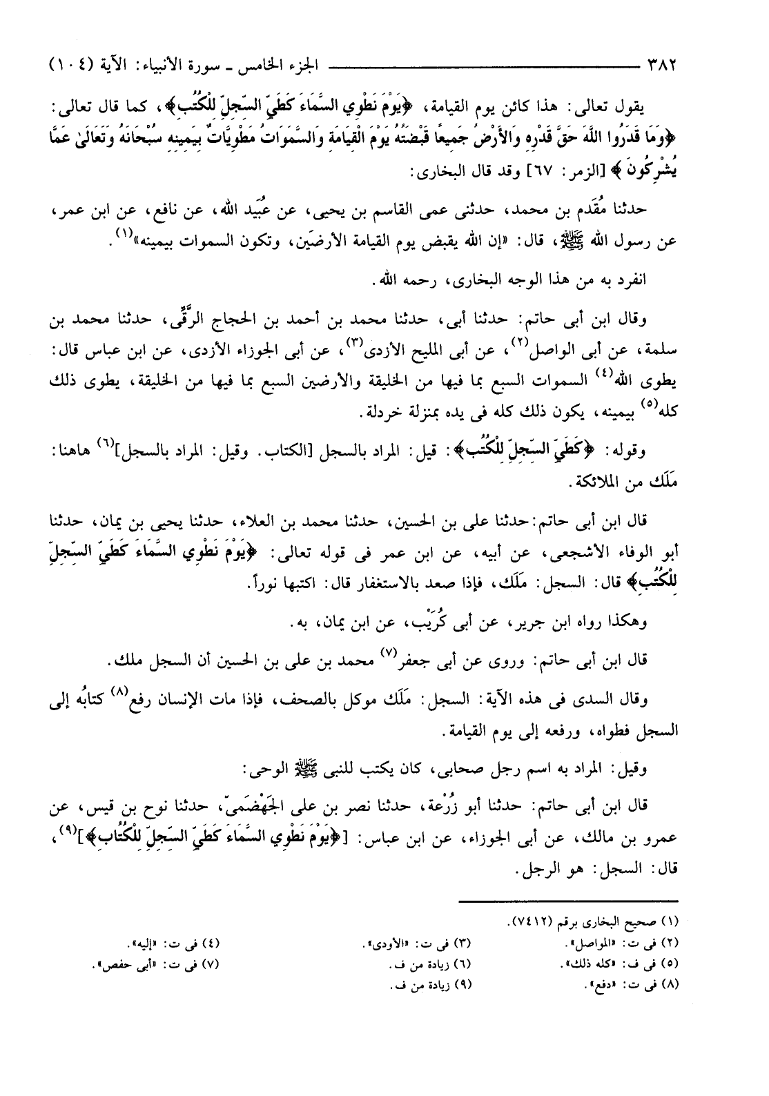 وَقَوْلُهُ: {كَطَيِّ السِّجِلِّ لِلْكُتُبِ} ، قِيلَ: الْمُرَادُ بِالسِّجِلِّ [الْكِتَابُ. وَقِيلَ: الْمُرَادُ بِالسِّجِلِّ] (6) هَاهُنَا: مَلَك مِنَ الْمَلَائِكَةِ.