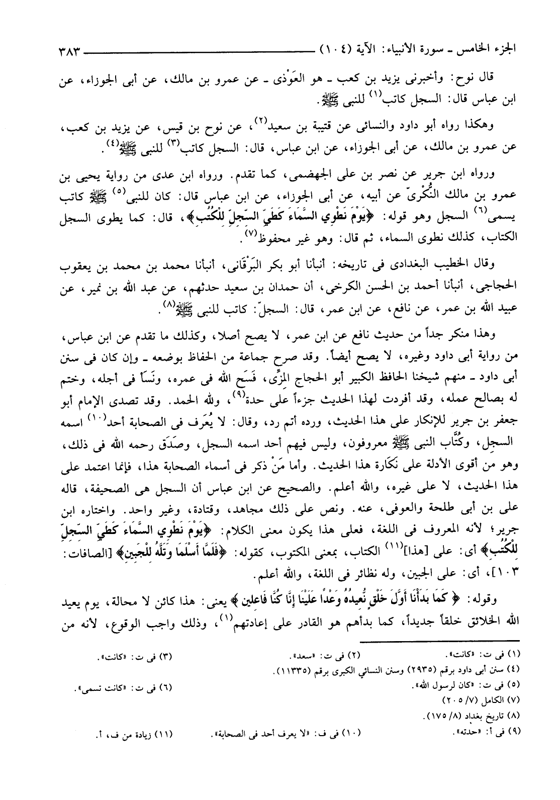 وَهَذَا مُنْكَرٌ جِدًّا مِنْ حَدِيثِ نَافِعٍ عَنِ ابْنِ عُمَرَ، لَا يَصِحُّ أَصْلًا وَكَذَلِكَ مَا تَقَدَّمَ عَنِ ابْنِ عَبَّاسٍ، مِنْ رِوَايَةِ أَبِي دَاوُدَ وَغَيْرِهِ، لَا يَصِحُّ أَيْضًا. وَقَدْ صَرَّحَ جَمَاعَةٌ مِنَ الْحُفَّاظِ بِوَضْعِهِ -وَإِنْ كَانَ فِي سُنَنِ أَبِي دَاوُدَ-مِنْهُمْ شَيْخُنَا الْحَافِظُ الْكَبِيرُ أَبُو الْحَجَّاجِ المِزِّي، فَسَح اللَّهُ فِي عُمْرِهِ، ونَسَأ فِي أَجَلِهِ، وَخَتَمَ لَهُ بِصَالِحِ عَمَلِهِ، وَقَدْ أَفْرَدَتُ لِهَذَا الْحَدِيثِ جُزْءًا عَلَى حِدَةٍ (9) ، وَلِلَّهِ الْحَمْدُ. وَقَدْ تَصَدَّى الْإِمَامُ أبو جعفر بن جَرِيرٍ لِلْإِنْكَارِ عَلَى هَذَا الْحَدِيثِ، وَرَدَّهُ أَتَمَّ رَدٍّ، وَقَالَ: لَا يُعَرف فِي الصَّحَابَةِ أَحَدٌ (10) اسْمُهُ السجِل، وكُتَّاب النَّبِيِّ صَلَّى اللَّهُ عَلَيْهِ وَسَلَّمَ مَعْرُوفُونَ، وَلَيْسَ فِيهِمْ أَحَدٌ اسْمُهُ السِّجِلُّ، وصَدَق رَحِمَهُ اللَّهُ فِي ذَلِكَ، وَهُوَ مِنْ أَقْوَى الْأَدِلَّةِ عَلَى نَكَارة هَذَا الْحَدِيثِ. وَأَمَّا مَنْ ذَكَرَ فِي أَسْمَاءِ الصَّحَابَةِ هَذَا، فَإِنَّمَا اعْتَمَدَ عَلَى هَذَا الْحَدِيثِ، لَا عَلَى غَيْرِهِ، وَاللَّهُ أَعْلَمُ. وَالصَّحِيحُ عَنِ ابْنِ عَبَّاسٍ أَنَّ السِّجِلَّ هِيَ الصَّحِيفَةُ، قَالَهُ عَلِيُّ بْنُ أَبِي طَلْحَةَ وَالْعَوْفِيُّ، عَنْهُ. وَنَصَّ عَلَى ذَلِكَ مُجَاهِدٌ، وَقَتَادَةُ، وَغَيْرُ وَاحِدٍ. وَاخْتَارَهُ ابْنُ جَرِيرٍ؛ لِأَنَّهُ الْمَعْرُوفُ فِي اللُّغَةِ، فَعَلَى هَذَا يَكُونُ مَعْنَى الْكَلَامِ: {يَوْمَ نَطْوِي السَّمَاءَ كَطَيِّ السِّجِلِّ لِلْكُتُبِ} أَيْ: عَلَى [هَذَا] (11) الْكِتَابِ، بِمَعْنَى الْمَكْتُوبِ، كَقَوْلِهِ: {فَلَمَّا أَسْلَمَا وَتَلَّهُ لِلْجَبِينِ} [الصَّافَّاتِ:103] ، أَيْ: عَلَى الْجَبِينِ، وَلَهُ نَظَائِرُ فِي اللُّغَةِ، وَاللَّهُ أَعْلَمُ.