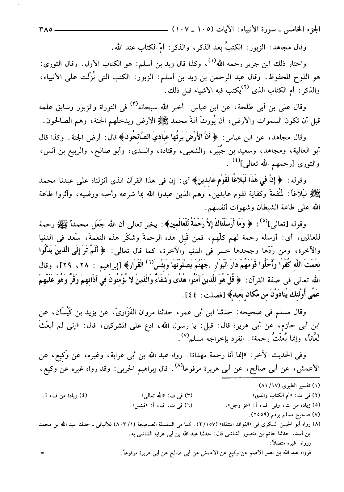 وَقَالَ عَلِيُّ بْنُ أَبِي طَلْحَةَ، عَنِ ابْنِ عَبَّاسٍ: أَخْبَرَ اللَّهُ سُبْحَانَهُ (3) فِي التَّوْرَاةِ وَالزَّبُورِ وَسَابِقِ عِلْمِهِ قَبْلَ أَنْ تكون السموات وَالْأَرْضُ، أَنْ يُورثَ أمةَ مُحَمَّدٍ صَلَّى اللَّهُ عَلَيْهِ وَسَلَّمَ الْأَرْضَ وَيُدْخِلَهُمُ الْجَنَّةَ، وَهُمُ الصَّالِحُونَ.