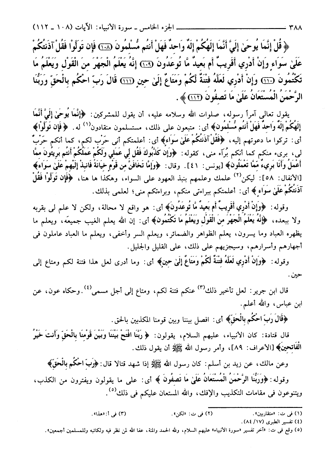 {قُلْ إِنَّمَا يُوحَى إِلَيَّ أَنَّمَا إِلَهُكُمْ إِلَهٌ وَاحِدٌ فَهَلْ أَنْتُمْ مُسْلِمُونَ (108) فَإِنْ تَوَلَّوْا فَقُلْ آذَنْتُكُمْ عَلَى سَوَاءٍ وَإِنْ أَدْرِي أَقَرِيبٌ أَمْ بَعِيدٌ مَا تُوعَدُونَ (109) إِنَّهُ يَعْلَمُ الْجَهْرَ مِنَ الْقَوْلِ وَيَعْلَمُ مَا تَكْتُمُونَ (110) وَإِنْ أَدْرِي لَعَلَّهُ فِتْنَةٌ لَكُمْ وَمَتَاعٌ إِلَى حِينٍ (111) قَالَ رَبِّ احْكُمْ بِالْحَقِّ وَرَبُّنَا الرَّحْمَنُ الْمُسْتَعَانُ عَلَى مَا تَصِفُونَ (112) } .