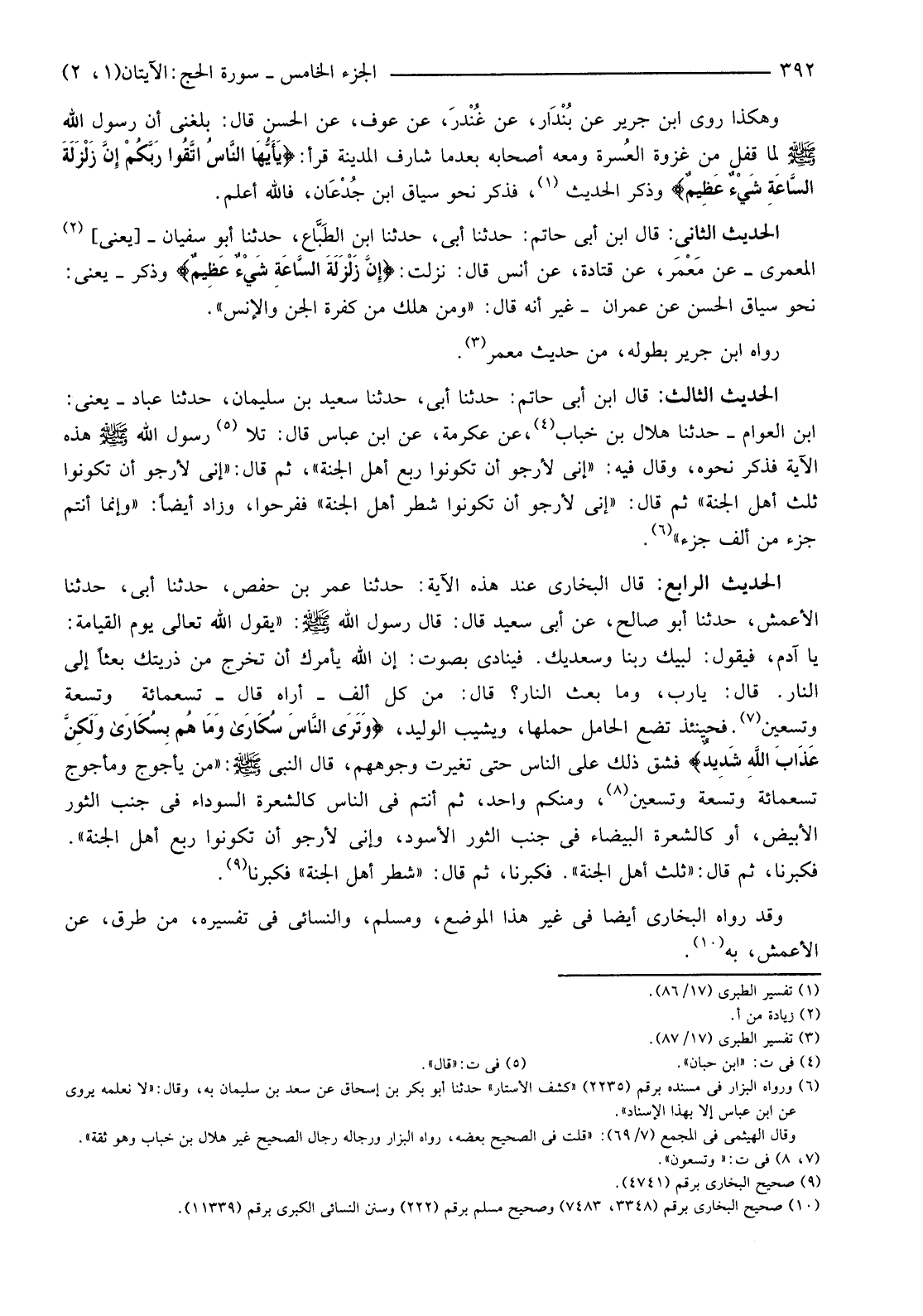 الْحَدِيثُ الرَّابِعُ: قَالَ الْبُخَارِيُّ عِنْدَ هَذِهِ الْآيَةِ: حَدَّثَنَا عُمَرُ بْنُ حَفْصٍ، حَدَّثَنَا أَبِي، حَدَّثَنَا الْأَعْمَشُ، حَدَّثَنَا أَبُو صَالِحٍ، عَنْ أَبِي سَعِيدٍ قَالَ: قَالَ رَسُولُ اللَّهِ صَلَّى اللَّهُ عَلَيْهِ وَسَلَّمَ: "يَقُولُ اللَّهُ تَعَالَى يَوْمَ الْقِيَامَةِ: يَا آدَمُ، فَيَقُولُ: لَبَّيْكَ رَبَّنَا وَسَعْدَيْكَ. فَيُنَادَى بِصَوْتٍ: إِنَّ اللَّهَ يَأْمُرُكَ أَنْ تُخْرِجَ مِنْ ذُرِّيَّتِكَ بَعْثًا إِلَى النَّارِ. قَالَ: يَا رَبِّ، وَمَا بَعْثُ النَّارِ؟ قَالَ: مِنْ كُلِّ أَلْفٍ -أَرَاهُ قَالَ-تِسْعَمِائَةٍ وَتِسْعَةً وَتِسْعِينَ (7) . فَحِينَئِذٍ تَضَعُ الْحَامِلُ حَمْلَهَا، وَيَشِيبُ الْوَلِيدُ، {وَتَرَى النَّاسَ سُكَارَى وَمَا هُمْ بِسُكَارَى وَلَكِنَّ عَذَابَ اللَّهِ شَدِيدٌ} فَشَقَّ ذَلِكَ عَلَى النَّاسِ حَتَّى تَغَيَّرَتْ وُجُوهُهُمْ، قَالَ النَّبِيُّ صَلَّى اللَّهُ عَلَيْهِ وسلم: "من يأجوج ومأجوج تسعمائة وتسعة وتسعين (8) ، وَمِنْكُمْ وَاحِدٌ، ثُمَّ أَنْتُمْ فِي النَّاسِ كَالشَّعْرَةِ السَّوْدَاءِ فِي جَنْبِ الثَّوْرِ الْأَبْيَضِ، أَوْ كَالشَّعْرَةِ الْبَيْضَاءِ فِي جَنْبِ الثَّوْرِ الْأَسْوَدِ، وَإِنِّي لَأَرْجُو أَنْ تَكُونُوا رُبُعَ أَهْلِ الْجَنَّةِ". فَكَبَّرْنَا، ثُمَّ قَالَ: "ثُلُثُ أَهْلِ الْجَنَّةِ". فَكَبَّرْنَا، ثُمَّ قَالَ: "شَطْرُ أَهْلِ الْجَنَّةِ" فَكَبَّرْنَا (9) .