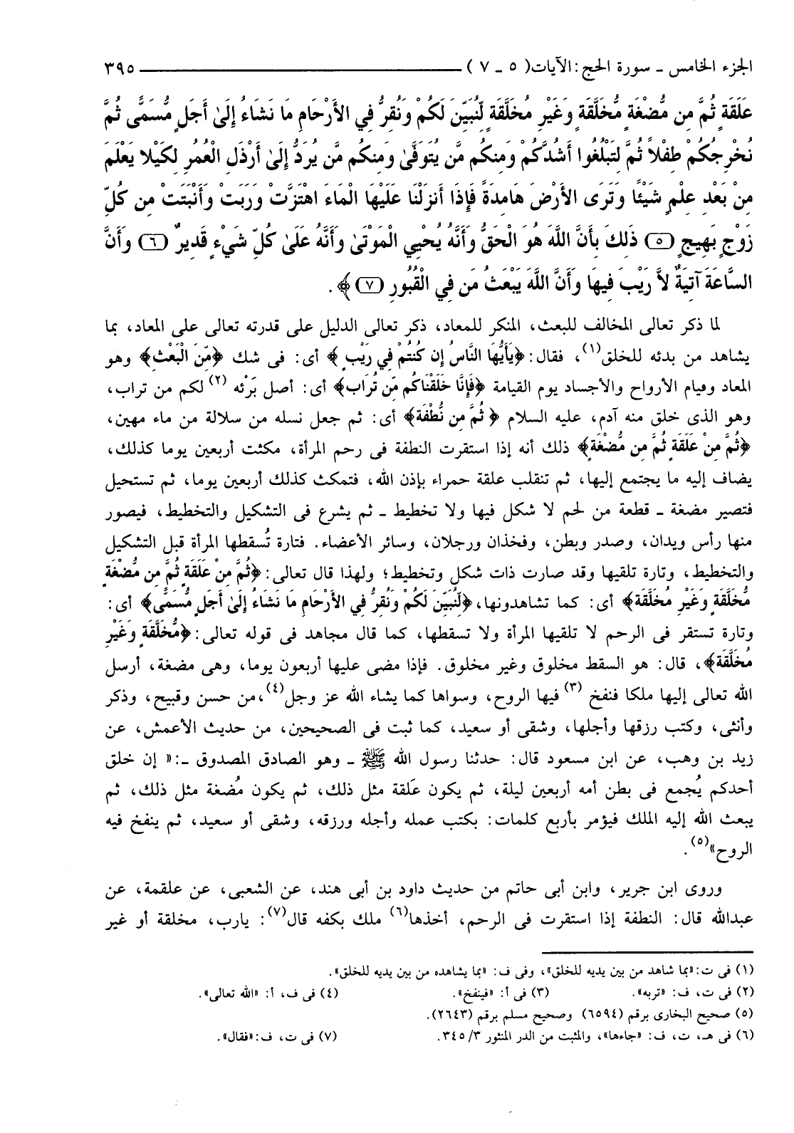 لَمَّا ذَكَرَ تَعَالَى الْمُخَالِفَ لِلْبَعْثِ، الْمُنْكِرَ لِلْمَعَادِ، ذَكَرَ تَعَالَى الدَّلِيلَ عَلَى قُدْرَتِهِ تَعَالَى عَلَى الْمَعَادِ، بِمَا يُشَاهَدُ مِنْ بَدْئِهِ لِلْخَلْقِ (1) ، فَقَالَ: {يَا أَيُّهَا النَّاسُ إِنْ كُنْتُمْ فِي رَيْبٍ} أَيْ: فِي شَكٍّ {مِنَ الْبَعْثِ} وَهُوَ الْمَعَادُ وَقِيَامُ الْأَرْوَاحِ وَالْأَجْسَادِ يَوْمَ الْقِيَامَةِ {فَإِنَّا خَلَقْنَاكُمْ مِنْ تُرَابٍ} أَيْ: أَصْلُ بَرْئه (2) لَكُمْ مِنْ تُرَابٍ، وَهُوَ الَّذِي خَلَقَ مِنْهُ آدَمَ، عَلَيْهِ السَّلَامُ {ثُمَّ مِنْ نُطْفَةٍ} أَيْ: ثُمَّ جَعَلَ نَسْلَهُ مِنْ سُلَالَةٍ مِنْ مَاءٍ مَهِينٍ، {ثُمَّ مِنْ عَلَقَةٍ ثُمَّ مِنْ مُضْغَةٍ} ذَلِكَ أَنَّهُ إِذَا اسْتَقَرَّتِ النُّطْفَةُ فِي رَحِمِ الْمَرْأَةِ، مَكَثَتْ أَرْبَعِينَ يَوْمًا كَذَلِكَ، يُضَافُ إِلَيْهِ مَا يَجْتَمِعُ إِلَيْهَا، ثُمَّ تَنْقَلِبُ عَلَقَةً حَمْرَاءَ بِإِذْنِ اللَّهِ، فَتَمْكُثُ كَذَلِكَ أَرْبَعِينَ يَوْمًا، ثُمَّ تَسْتَحِيلُ فَتَصِيرُ مُضْغَةً -قِطْعَةً مِنْ لَحْمٍ لَا شَكْلَ فِيهَا وَلَا تَخْطِيطَ-ثُمَّ يُشْرَعُ فِي التَّشْكِيلِ وَالتَّخْطِيطِ، فَيُصَوَّرُ مِنْهَا رَأْسٌ وَيَدَانِ، وَصَدْرٌ وَبَطْنٌ، وَفَخْذَانِ وَرِجْلَانِ، وَسَائِرُ الْأَعْضَاءِ. فَتَارَةً تُسقطها الْمَرْأَةُ قَبْلَ التَّشْكِيلِ وَالتَّخْطِيطِ، وَتَارَةً تُلْقِيهَا وَقَدْ صَارَتْ ذَاتَ شَكْلٍ وَتَخْطِيطٍ؛ وَلِهَذَا قَالَ تَعَالَى: {ثُمَّ مِنْ عَلَقَةٍ ثُمَّ مِنْ مُضْغَةٍ مُخَلَّقَةٍ وَغَيْرِ مُخَلَّقَةٍ} أَيْ: كَمَا تُشَاهِدُونَهَا، {لِنُبَيِّنَ لَكُمْ وَنُقِرُّ فِي الأرْحَامِ مَا نَشَاءُ إِلَى أَجَلٍ مُسَمًّى} أَيْ: وَتَارَةً تَسْتَقِرُّ فِي الرَّحِمِ لَا تُلْقِيهَا الْمَرْأَةُ وَلَا تُسْقِطُهَا، كَمَا قَالَ مُجَاهِدٌ فِي قَوْلِهِ تَعَالَى: {مُخَلَّقَةٍ وَغَيْرِ مُخَلَّقَةٍ} قَالَ: هُوَ السَّقْطُ مَخْلُوقٌ وَغَيْرُ مَخْلُوقٍ. فَإِذَا مَضَى عَلَيْهَا أَرْبَعُونَ يَوْمًا، وَهِيَ مُضْغَةٌ، أَرْسَلَ اللَّهُ تَعَالَى إِلَيْهَا مَلَكًا فَنَفَخَ (3) فِيهَا الرَّوْحَ، وَسَوَّاهَا كَمَا يَشَاءُ اللَّهُ عَزَّ وَجَلَّ (4) ، مِنْ حَسَنٍ وَقَبِيحٍ، وَذَكَرٍ وَأَنْثَى، وَكَتَبَ رِزْقَهَا وَأَجَلَهَا، وَشِقِّيٌ أَوْ سَعِيدٌ، كَمَا ثَبَتَ فِي الصَّحِيحَيْنِ، مِنْ حَدِيثِ الْأَعْمَشِ، عَنْ زَيْدِ بْنِ وَهْبٍ، عَنِ ابْنِ مَسْعُودٍ قَالَ: حَدَّثَنَا رَسُولُ اللَّهِ صَلَّى اللَّهُ عَلَيْهِ وَسَلَّمَ -وَهُوَ الصَّادِقُ الْمَصْدُوقُ-:"إِنَّ خَلْقَ أَحَدِكُمْ يُجمع فِي بَطْنِ أُمِّهِ أَرْبَعِينَ لَيْلَةً، ثُمَّ يَكُونُ عَلَقَةً مِثْلَ ذَلِكَ، ثُمَّ يَكُونُ مُضغة مِثْلَ ذَلِكَ، ثُمَّ يَبْعَثُ اللَّهُ إِلَيْهِ الْمَلَكَ فَيُؤْمَرُ بِأَرْبَعِ كَلَمَّاتٍ: بِكَتْبِ عَمَلِهِ وَأَجَلِهِ وَرِزْقِهِ، وَشَقِّيٌ أَوْ سَعِيدٌ، ثُمَّ يُنْفَخُ فِيهِ الرُّوحُ" (5) .