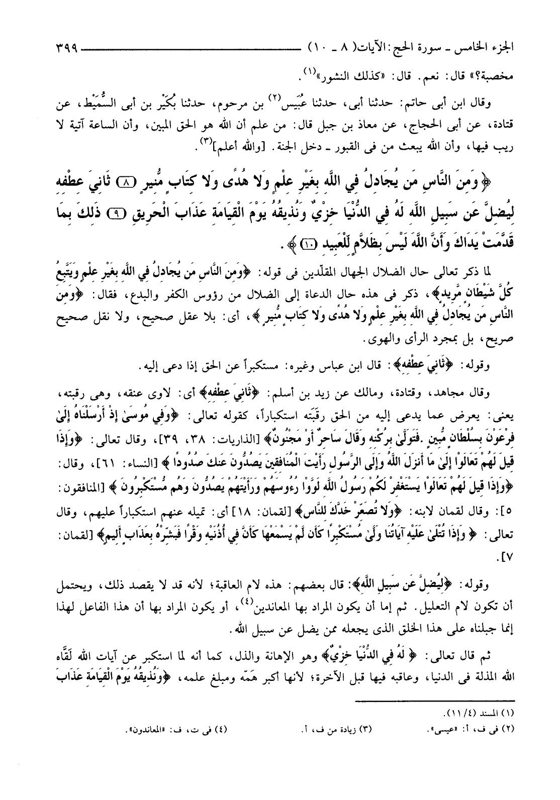 {وَمِنَ النَّاسِ مَنْ يُجَادِلُ فِي اللَّهِ بِغَيْرِ عِلْمٍ وَلا هُدًى وَلا كِتَابٍ مُنِيرٍ (8) ثَانِيَ عِطْفِهِ لِيُضِلَّ عَنْ سَبِيلِ اللَّهِ لَهُ فِي الدُّنْيَا خِزْيٌ وَنُذِيقُهُ يَوْمَ الْقِيَامَةِ عَذَابَ الْحَرِيقِ (9) ذَلِكَ بِمَا قَدَّمَتْ يَدَاكَ وَأَنَّ اللَّهَ لَيْسَ بِظَلامٍ لِلْعَبِيدِ (10) } .