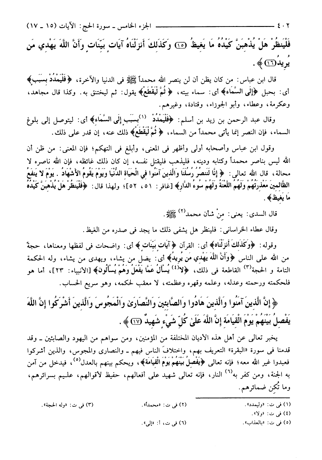وَقَوْلُ ابْنِ عَبَّاسٍ وَأَصْحَابِهِ أَوْلَى وَأَظْهَرُ فِي الْمَعْنَى، وَأَبْلَغُ فِي التَّهَكُّمِ؛ فَإِنَّ الْمَعْنَى: مَنْ ظَنَّ أَنَّ اللَّهَ لَيْسَ بِنَاصِرٍ مُحَمَّدًا وَكِتَابَهُ وَدِينَهُ، فَلْيَذْهَبْ فَلْيَقْتُلْ نَفْسَهُ، إِنْ كَانَ ذَلِكَ غَائِظَهُ، فَإِنَّ اللَّهَ نَاصِرُهُ لَا مَحَالَةَ، قَالَ اللَّهُ تَعَالَى: {إِنَّا لَنَنْصُرُ رُسُلَنَا وَالَّذِينَ آمَنُوا فِي الْحَيَاةِ الدُّنْيَا وَيَوْمَ يَقُومُ الأشْهَادُ. يَوْمَ لَا يَنْفَعُ الظَّالِمِينَ مَعْذِرَتُهُمْ وَلَهُمُ اللَّعْنَةُ وَلَهُمْ سُوءُ الدَّارِ} [غَافِرٍ: 51، 52] ؛ وَلِهَذَا قَالَ: {فَلْيَنْظُرْ هَلْ يُذْهِبَنَّ كَيْدُهُ مَا يَغِيظُ}