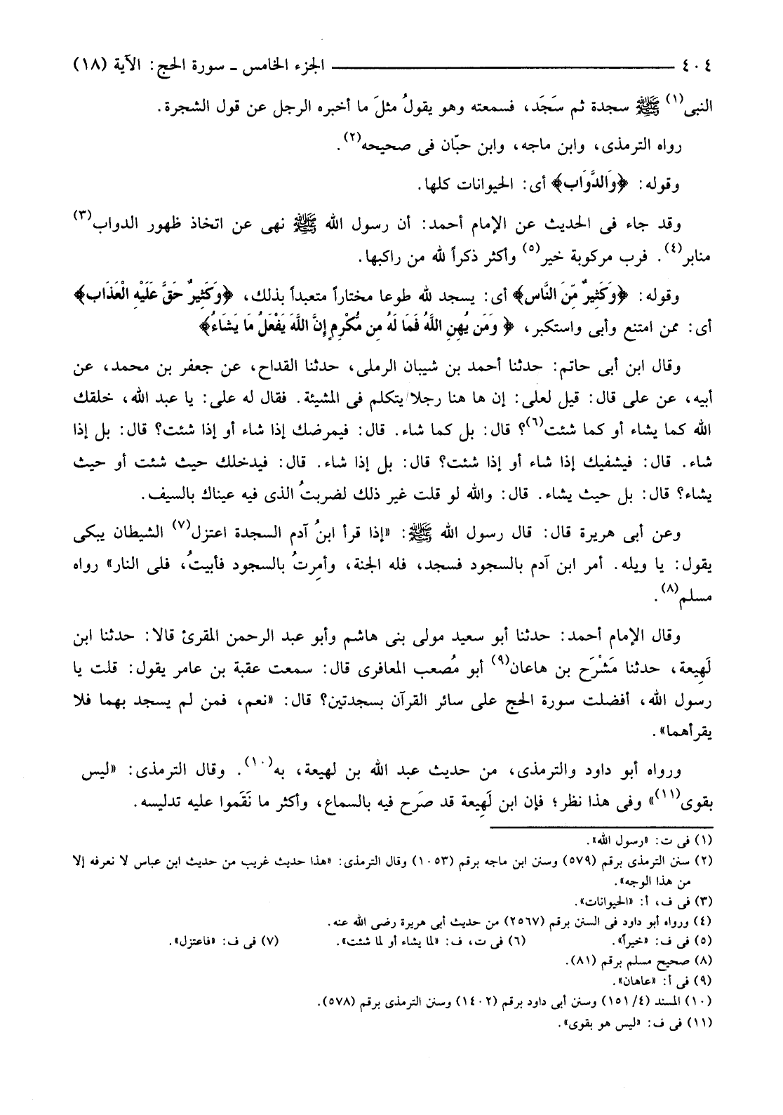 وَقَوْلُهُ: {وَكَثِيرٌ مِنَ النَّاسِ} أَيْ: يَسْجُدُ لِلَّهِ طَوْعًا مُخْتَارًا مُتَعَبِّدًا بِذَلِكَ، {وَكَثِيرٌ حَقَّ عَلَيْهِ الْعَذَابُ} أَيْ: مِمَّنِ امْتَنَعَ وَأَبَى وَاسْتَكْبَرَ، {وَمَنْ يُهِنِ اللَّهُ فَمَا لَهُ مِنْ مُكْرِمٍ إِنَّ اللَّهَ يَفْعَلُ مَا يَشَاءُ} .